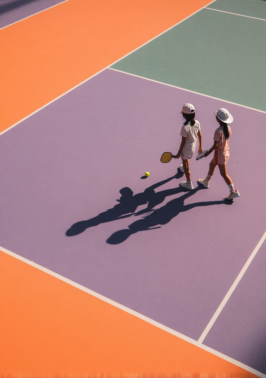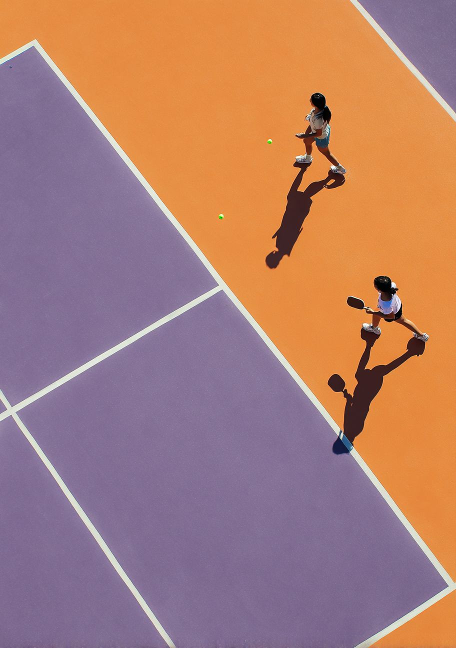 top photograph two asian female kids playing pickleball on an modern outdoor pickleball court. the floor has a purple color with orange lines on a white background. strong shadow --ar 70:99 --raw --v 7.0
