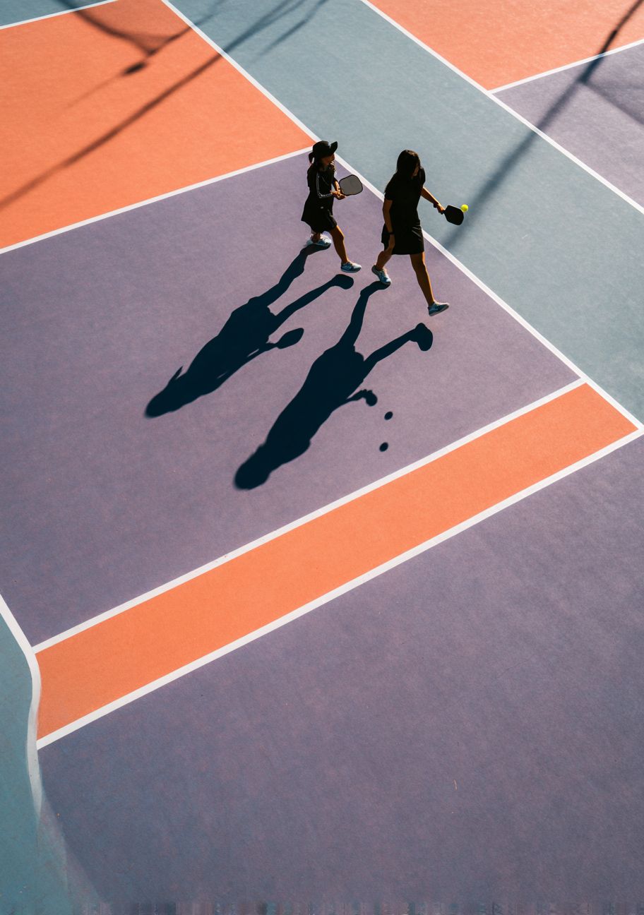 Deux filles asiatiques jouent au pickleball sur un terrain moderne en plein air. Le sol est violet avec des lignes orange sur un fond blanc. Forte ombre.