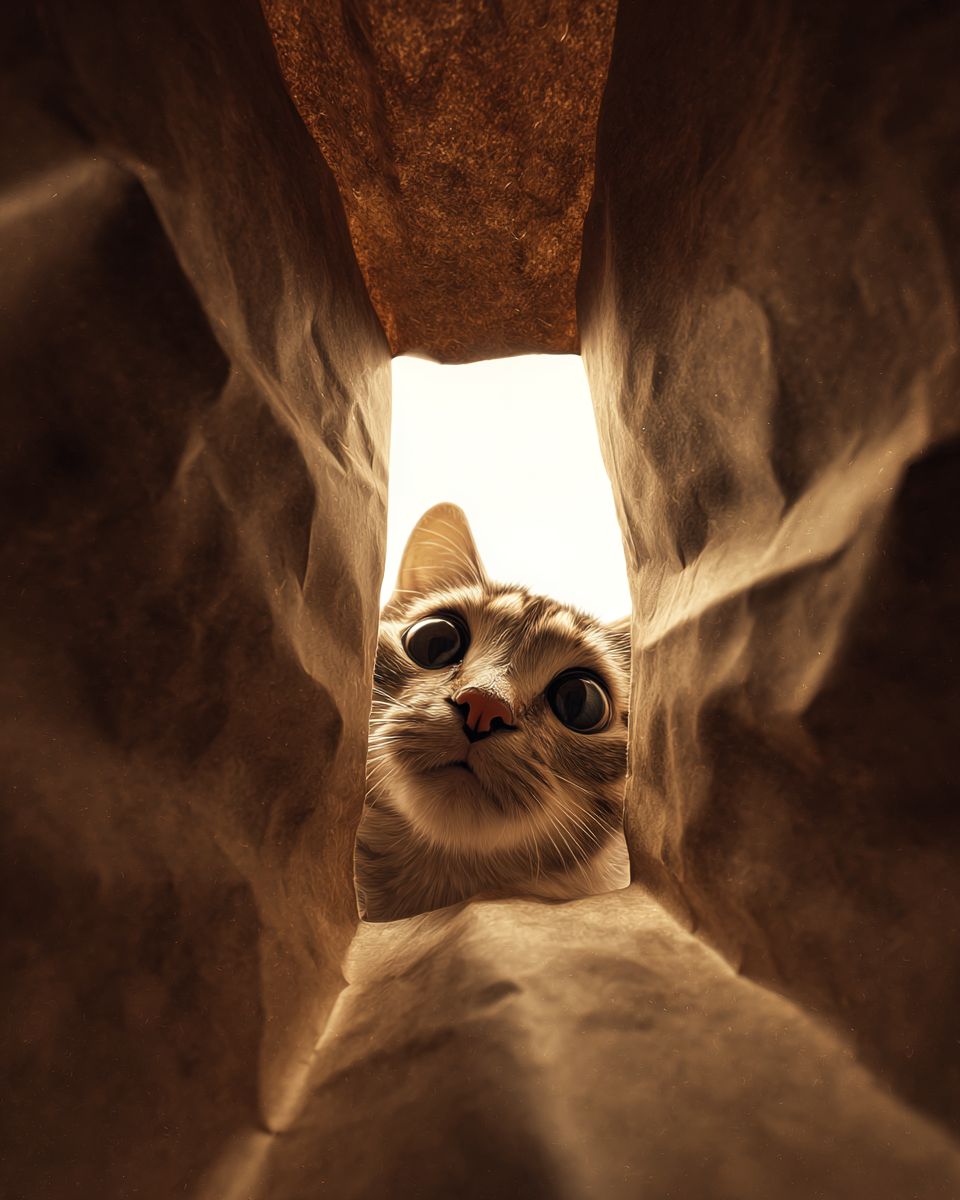 A realistic photo taken from inside a paper bag, looking upward through a slightly open rectangular gap at the top. A cat with big eyes and happy face is leaning over the opening, looking curiously inside. The cat is centered and moderately close, framed by the edges of the bag. The inside of the bag is softly lit warm brown tones on the paper, darker shadows on the sides, and bright daylight coming through the top opening. The composition is symmetrical, cinematic, ultra detailed, 4K, shallow depth of field, realistic texture of paper and fur. --ar 4:5 --stylize 50 --v 7.0