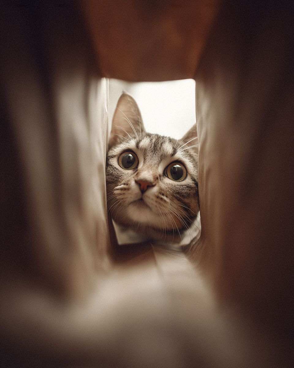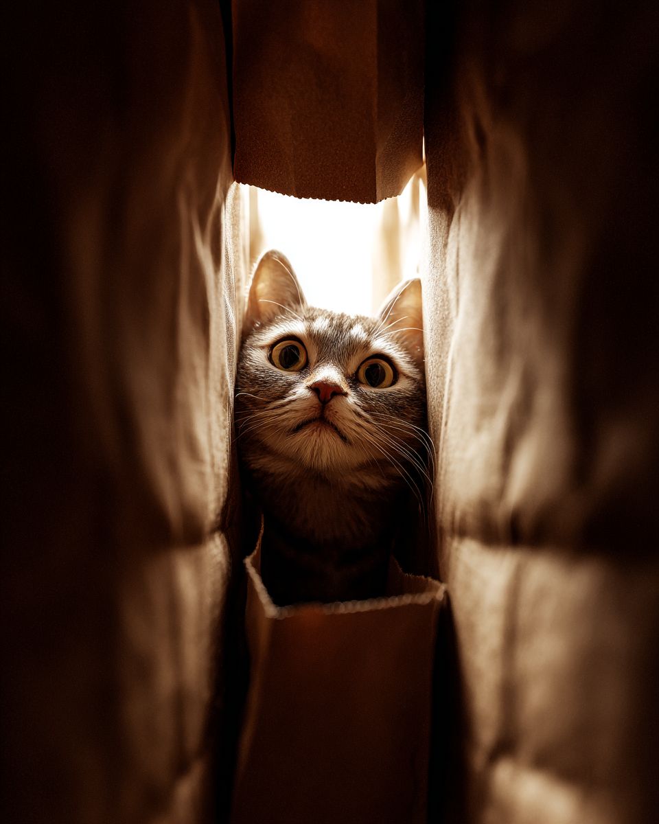 Une photo réaliste prise de l'intérieur d'un sac en papier, regardant vers le haut à travers une ouverture rectangulaire légèrement ouverte en haut. Un chat avec de grands yeux et un visage heureux se penche sur l'ouverture, regardant curieusement à l'intérieur. Le chat est centré et modérément proche, encadré par les bords du sac. L'intérieur du sac est doucement éclairé de tons bruns chauds, avec des ombres plus sombres sur les côtés et une lumière du jour brillante passant par l'ouverture supérieure. La composition est symétrique, cinématographique, ultra-détaillée, 4K, avec une faible profondeur de champ et une texture réaliste du papier et de la fourrure.