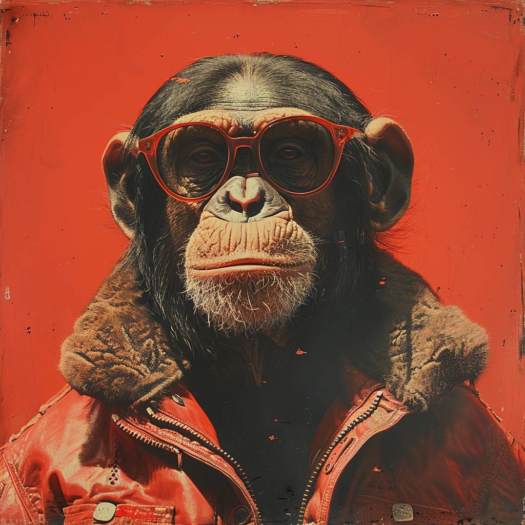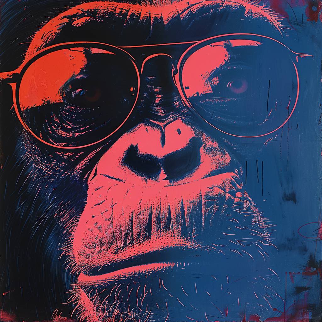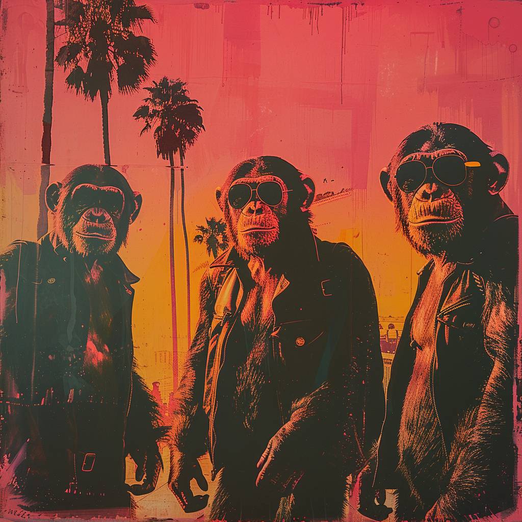 Une affiche de singes libres dans le style de Karl Lagerfeld, Prada, James Rosenquist – Art Pop, Daniel Arsham – Art Architectural, Liu Bolin – Art Invisible, Ai Weiwei – Art Politique, Banksy – Art de Rue et Jenny Holzer – Art Conceptuel.