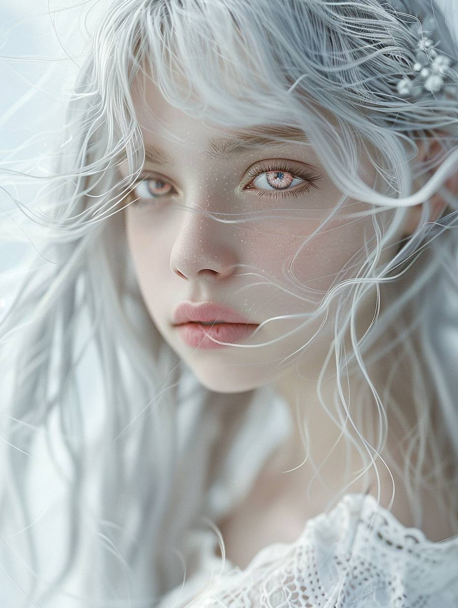 Une fille aux cheveux argentés et aux yeux roses clair portant une robe blanche, présentant une scène délicate et onirique capturée par la photographie de portrait ultraréaliste.