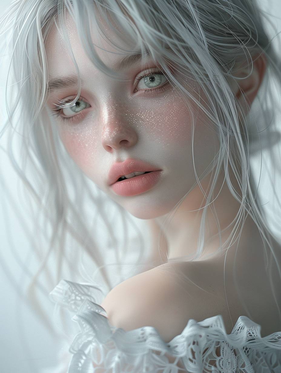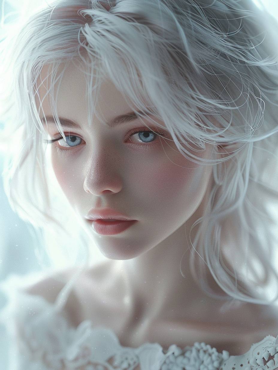A girl with silver hair, light pink eyes and babylike skin wearing a white dress, with a delicate face and pale color tone. She has beautiful makeup in a dreamy scene with natural lighting and a soft focus closeup, captured through ultrarealistic portrait photography in the style of fantasy art at a high resolution. --ar 3:4 --v 6.0