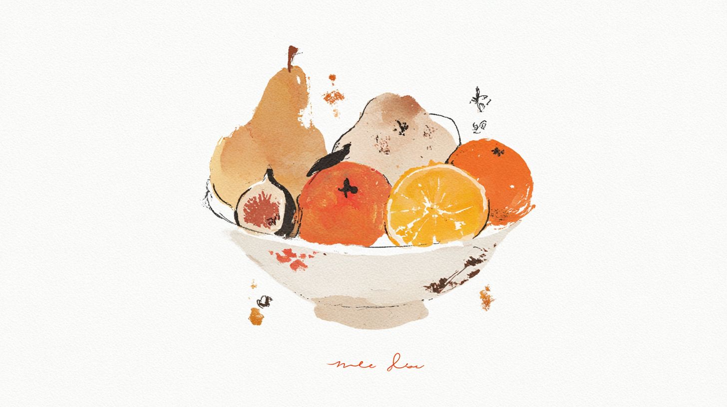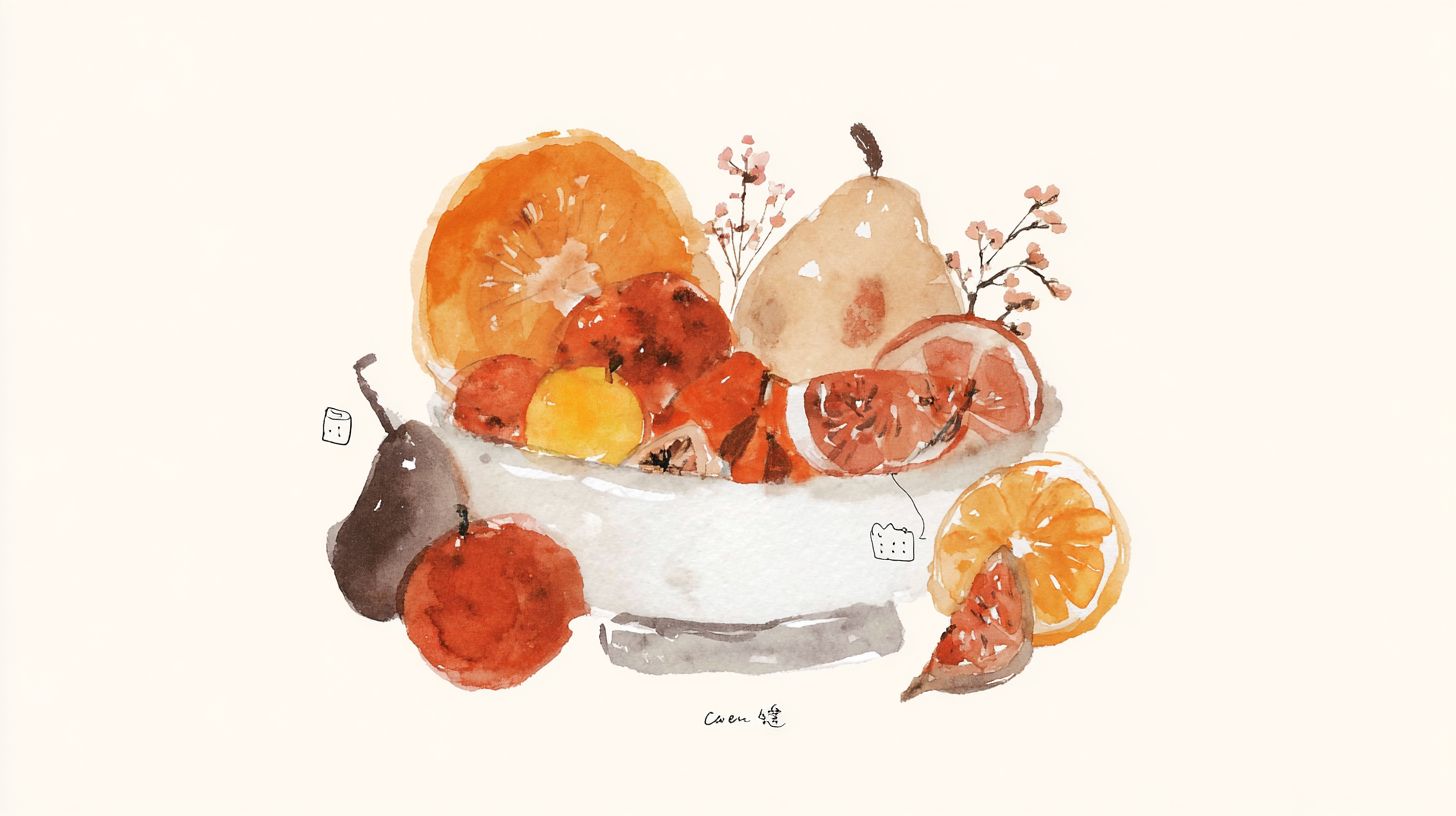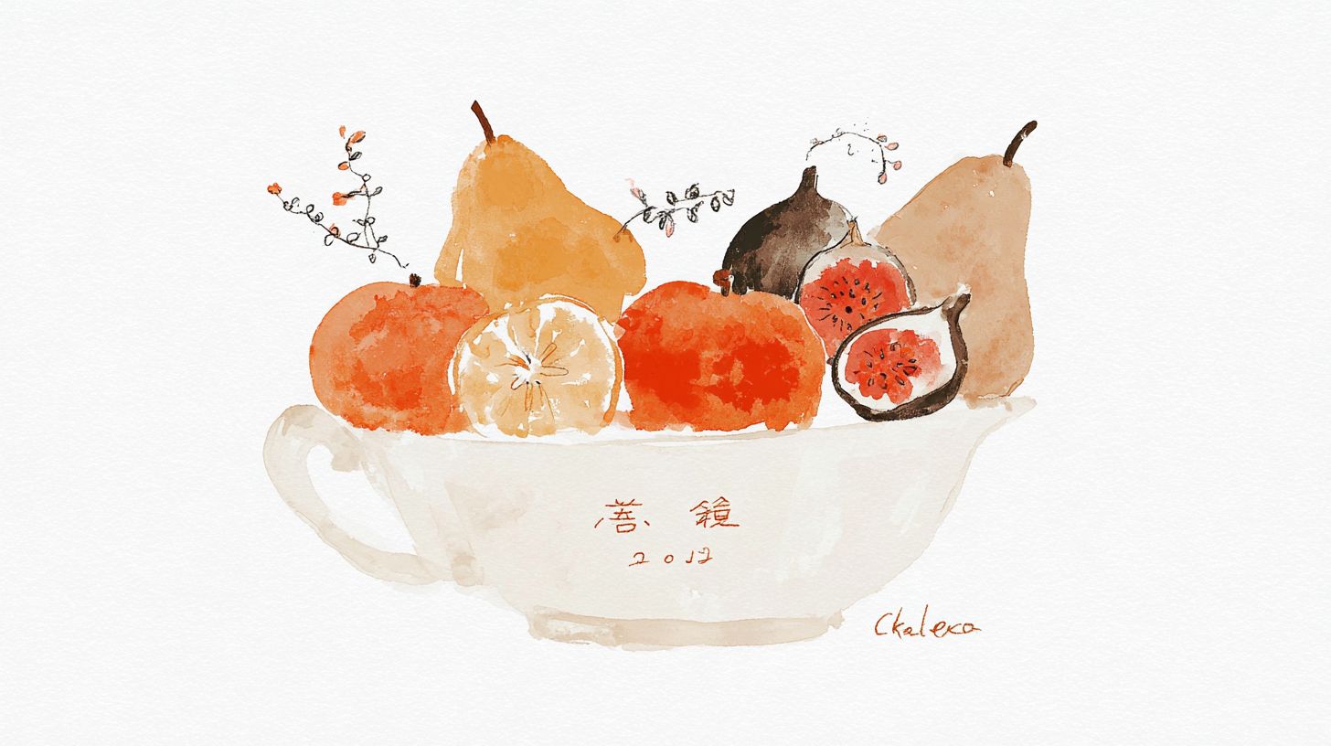a ceramic bowl with autumn fruits, as pears, apples, oranges, figs and peachs, one the bowl have some cosy drawings, white background, neutral tones --sref 2494351770 --ar 16:9 --s 50 --v 7.0