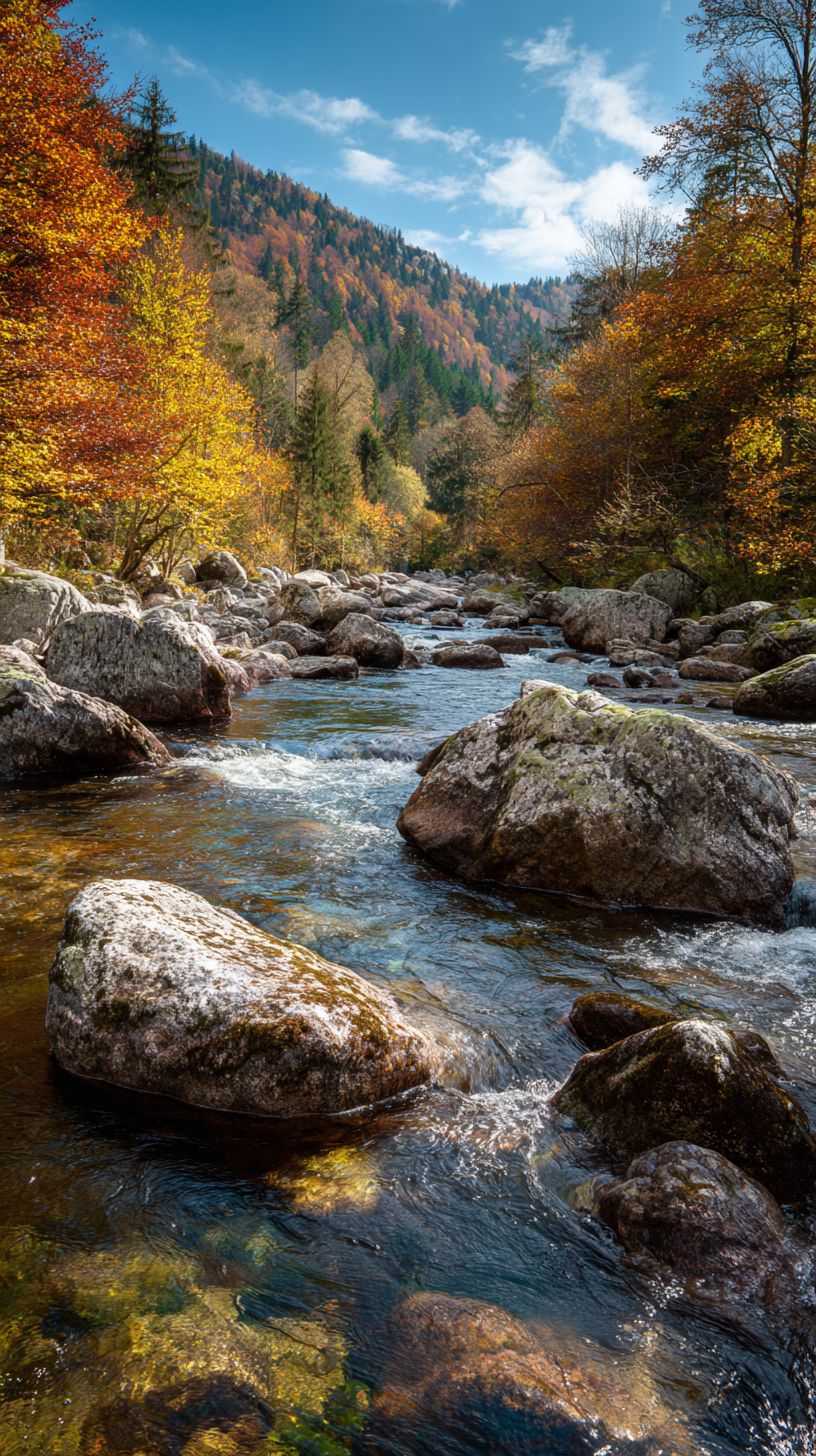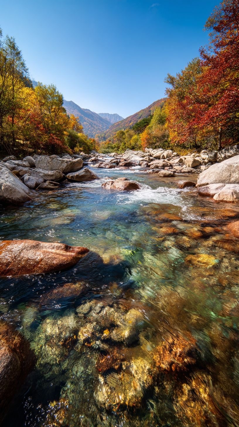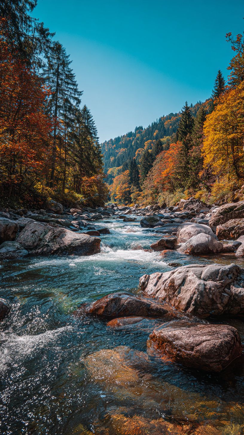 ultra realistic photo of an autumn mountain stream in the upper reaches of a river, clear transparent water flowing strongly between naturally scattered large stones, uneven rock patterns, bright sunlight shining on the water surface, vivid autumn leaves in red, orange, and yellow on both sides, wide blue sky, deep sense of depth, natural forest atmosphere, highly detailed DSLR photography, --ar 9:16 --raw