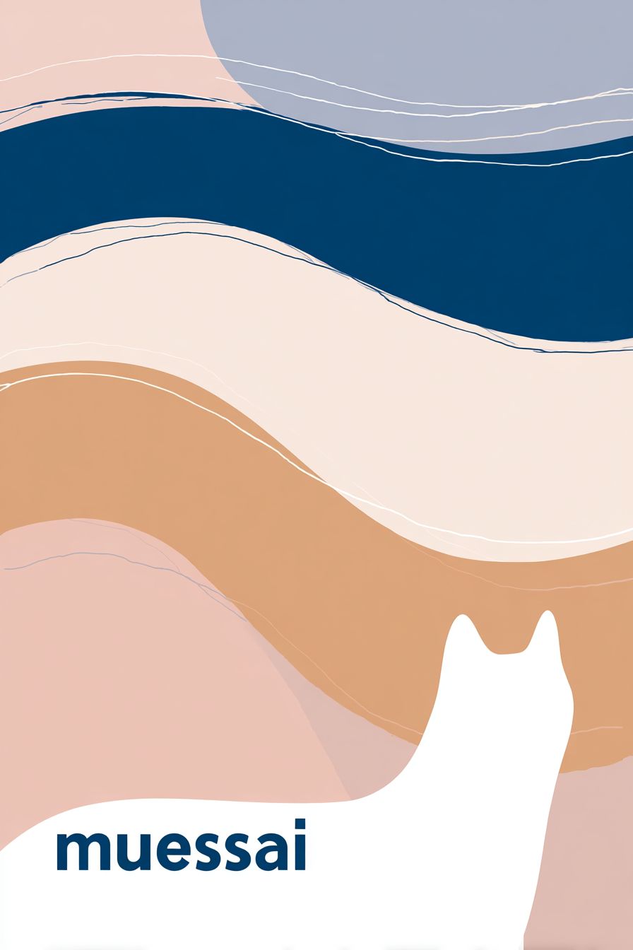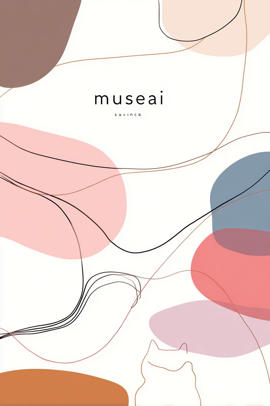 Illustration vectorielle mettant en avant des lignes abstraites et des lignes courbes, art linéaire, composée de blocs de couleurs douces, minimalisme, palette de couleurs dopamine, design de ligne superposé à plusieurs blocs de couleur de forme arc irrégulière d'un petit chat, textures naturelles, décoration, surréalisme, avec une art avant-gardiste et un titre principal en police élégante en petit anglais 'musesai' en accent, composition magistrale, affiche minimaliste, qualité haute définition, chef-d'œuvre, affiche primée. Fond blanc pur.