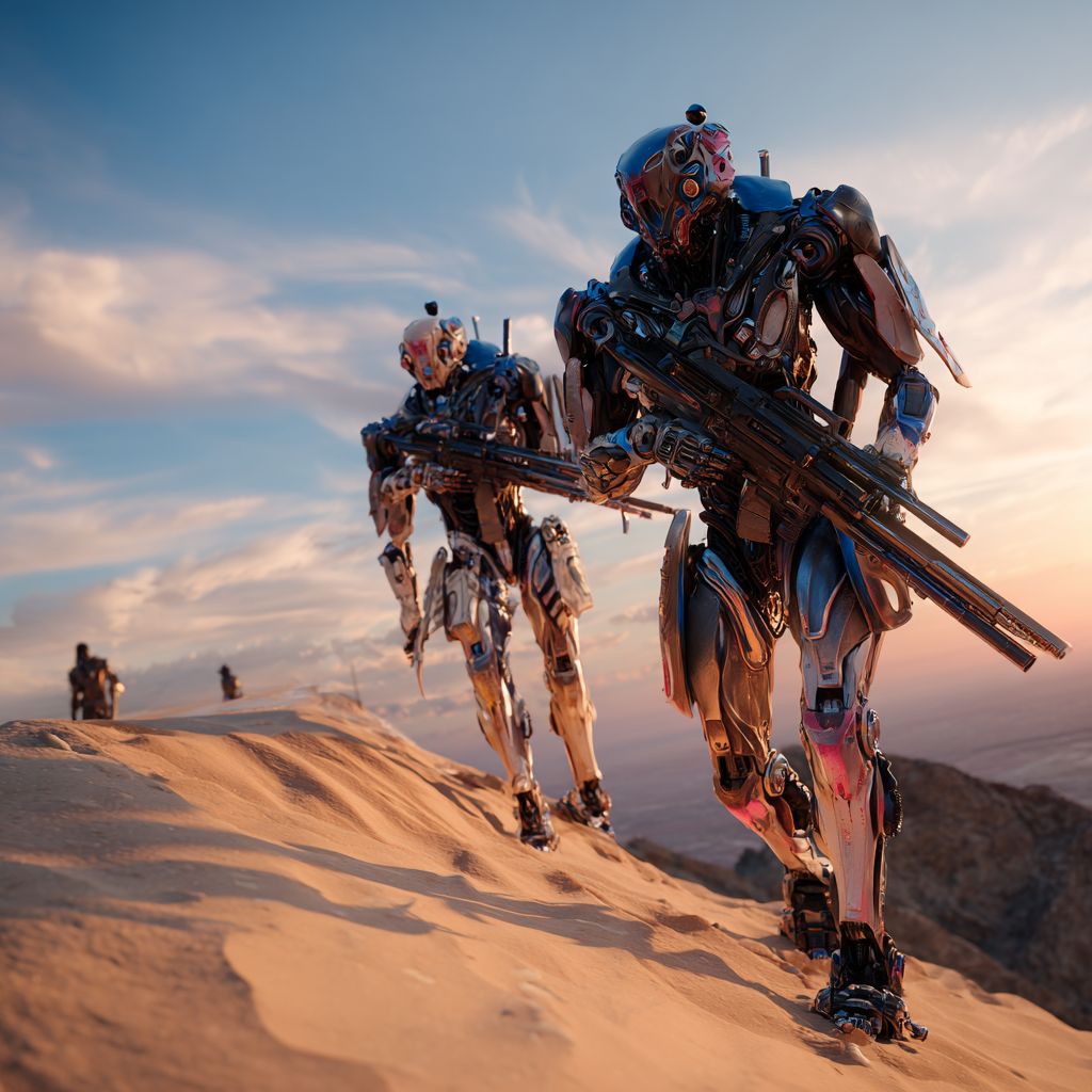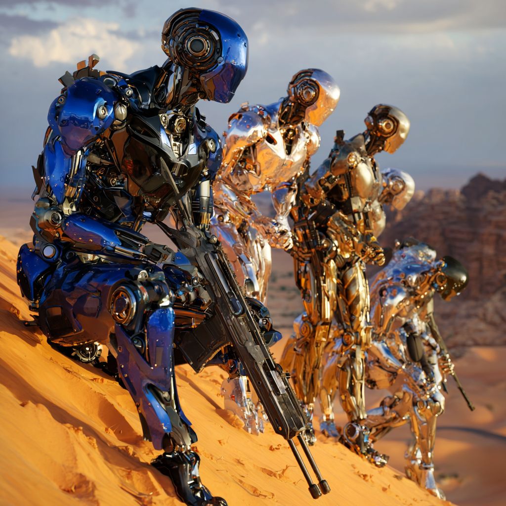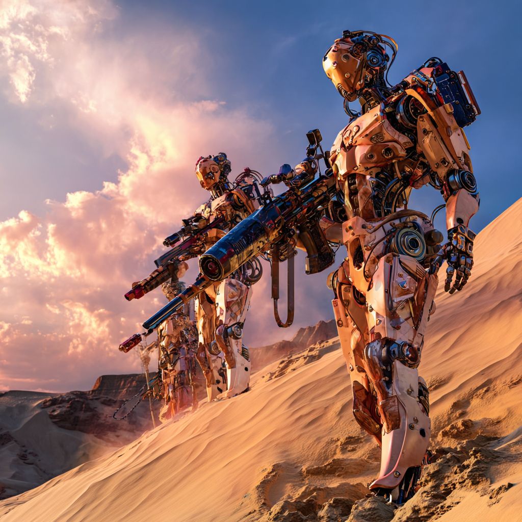 Des robots humanoïdes sont sortis au sommet d'une colline de sable, armés, regardant menaçamment vers le désert, rappelant une scène d'un film d'action.