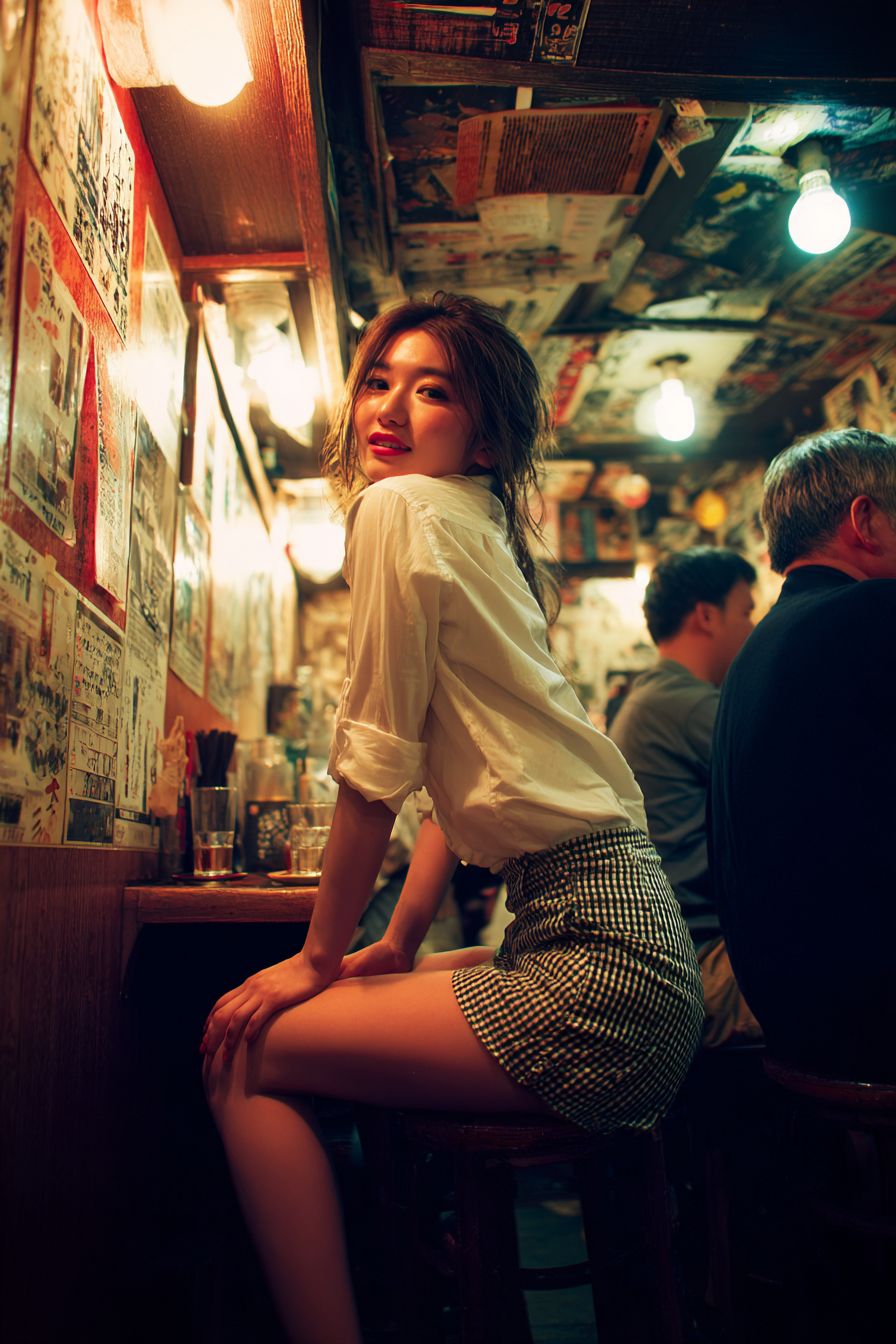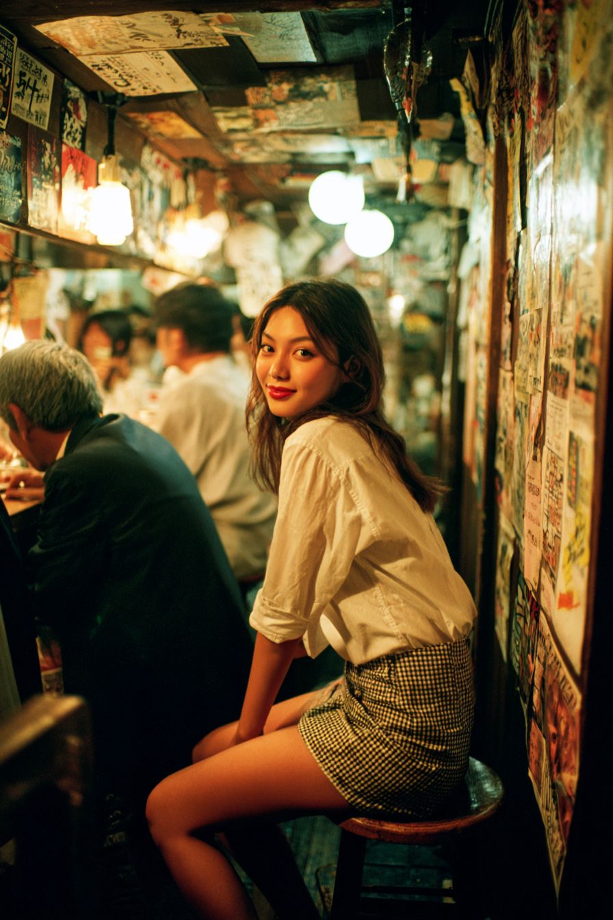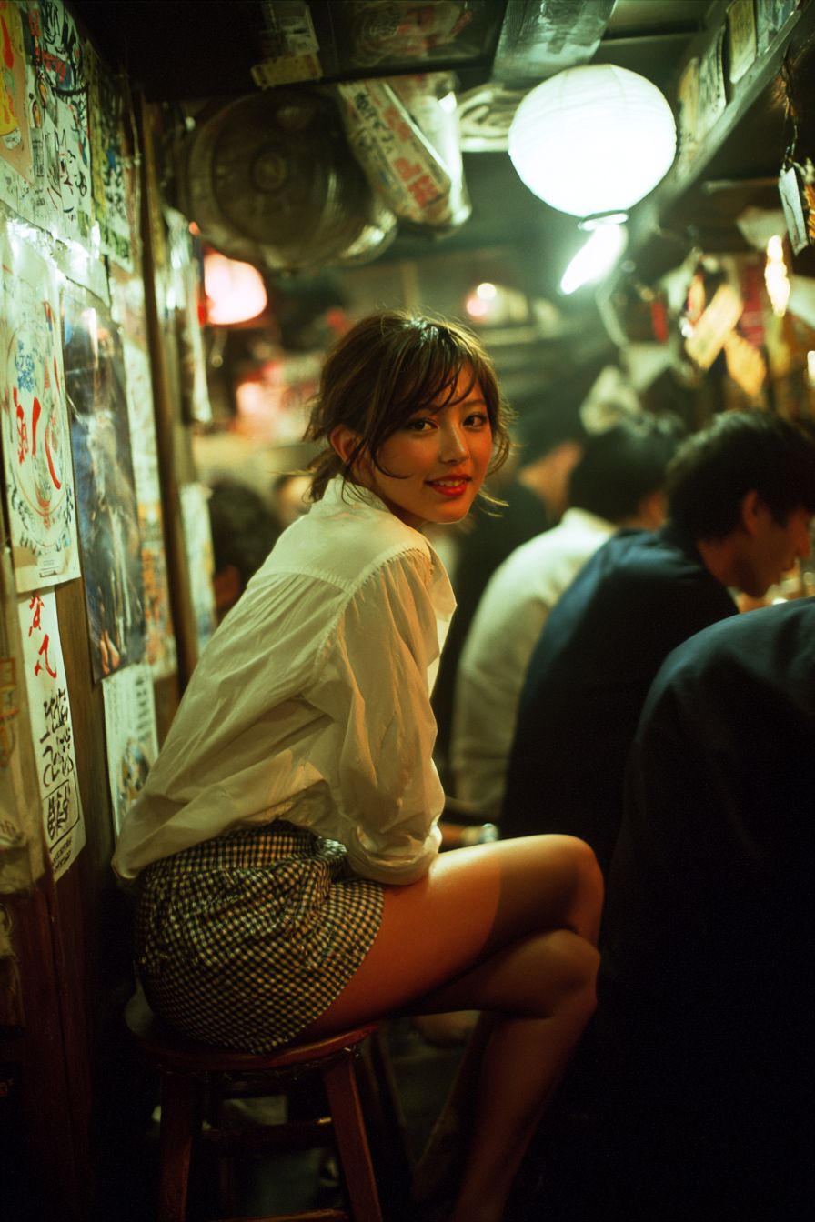 Un instantané pris avec flash dans un petit izakaya japonais bondé, rempli de menus écrits à la main, d'anciens posters et de textures en bois. L'éclairage provient d'un flash direct sur l'appareil photo, créant de brillants reflets, des ombres dures et une texture légèrement granuleuse qui renforce la sensation de spontanéité. Le sujet principal est une jeune femme assise sur un tabouret de bar en bois, tournant légèrement son corps et regardant par-dessus son épaule en direction de l'appareil photo. Elle porte une chemise blanche à boutons et une courte jupe à taille haute à carreaux, révélant ses jambes et ajoutant au ton jeune et décontracté de la scène. Son visage est doucement illuminé par le flash, avec des joues rosies, des lèvres rouges brillantes et des yeux croisant l'objectif avec un regard subtil, joueur mais expressif. Le sourire est doux mais suggestif, portant un léger sentiment de conscience et de chaleur. Sa posture et son regard créent une tension délicate entre confiance et douceur. L'arrière-plan est sombre et bondé de clients plus âgés vêtus de vêtements sombres, contrastant avec sa présence lumineuse. La composition est serrée et spontanée, typique de la photographie avec appareil photo jetable japonaise des années 90 ; fort contraste de flash, léger flou et imperfections naturelles. L'ambiance globale est nostalgique, chaleureuse et légèrement ambiguë, capturant un moment qui semble réel, proche et chargé d'émotion, comme un souvenir personnel illuminé par un flash plutôt qu'un portrait mis en scène.