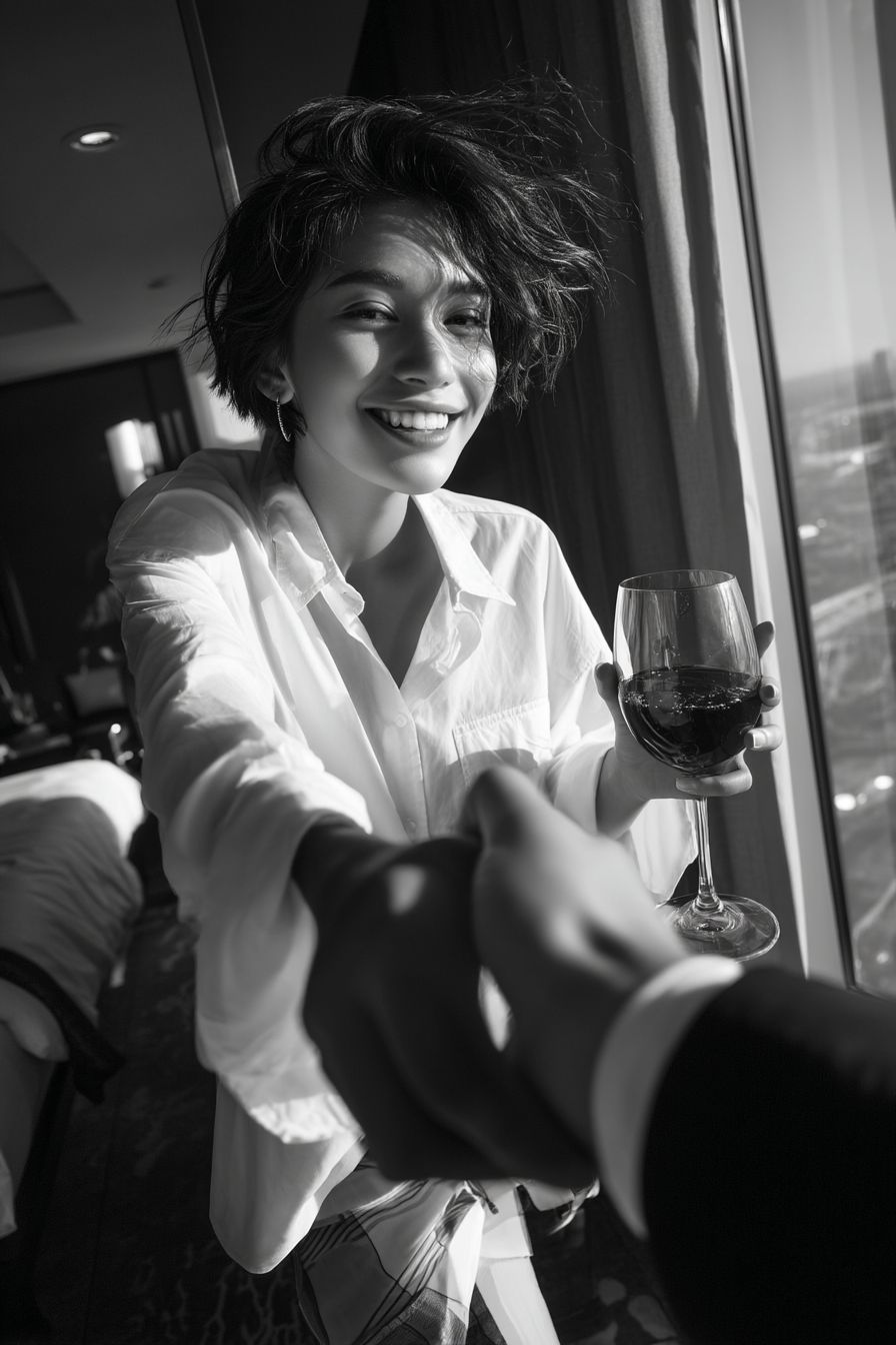 A happy young Asian woman, with disheveled short hair blown by the wind, wearing an oversized white button-down shirt, holding a glass of red wine, and taking the hand of a man in a suit into a hotel room (the camera is the first-person perspective of the man in the suit, cut from the position where they hold hands), looking back at the camera and smiling from the bottom of her heart. Black and white photography, high contrast, emotional, candid, fashion photography, cinematic lighting, dramatic backlighting, rim light, shallow depth of field, strong bokeh, high resolution, subtle film grain, 35mm lens, 4k --ar 2:3 --quality 4 --v 7.0 --p 78soi4x --s 50