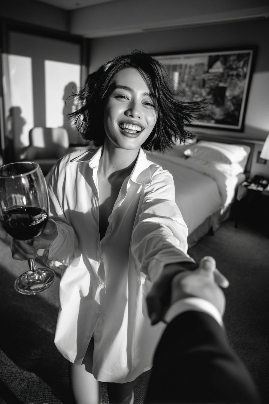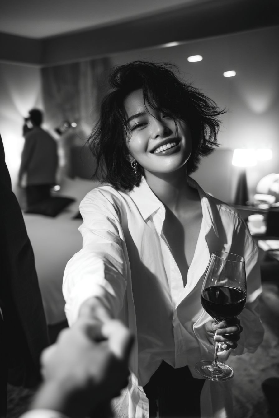 Une jeune femme asiatique heureuse, avec des cheveux courts en désordre soufflés par le vent, portant une chemise blanche ample, tenant un verre de vin rouge et prenant la main d'un homme en costume pour entrer dans une chambre d'hôtel (la caméra est la perspective à la première personne de l'homme en costume, coupée de la position où ils se tiennent par la main), regardant derrière elle vers la caméra et souriant du fond du cœur. Photographie en noir et blanc, fort contraste, émotionnelle, candide, photographie de mode, éclairage cinématographique, rétroéclairage dramatique, lumière de contour, faible profondeur de champ, fort bokeh, haute résolution, grain de film subtil, objectif de 35 mm, 4k.