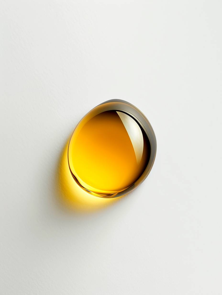 Une photographie réaliste en vue du dessus d'une goutte d'huile incolore sur une surface blanche, utilisant un éclairage de studio et un flash blanc intense.