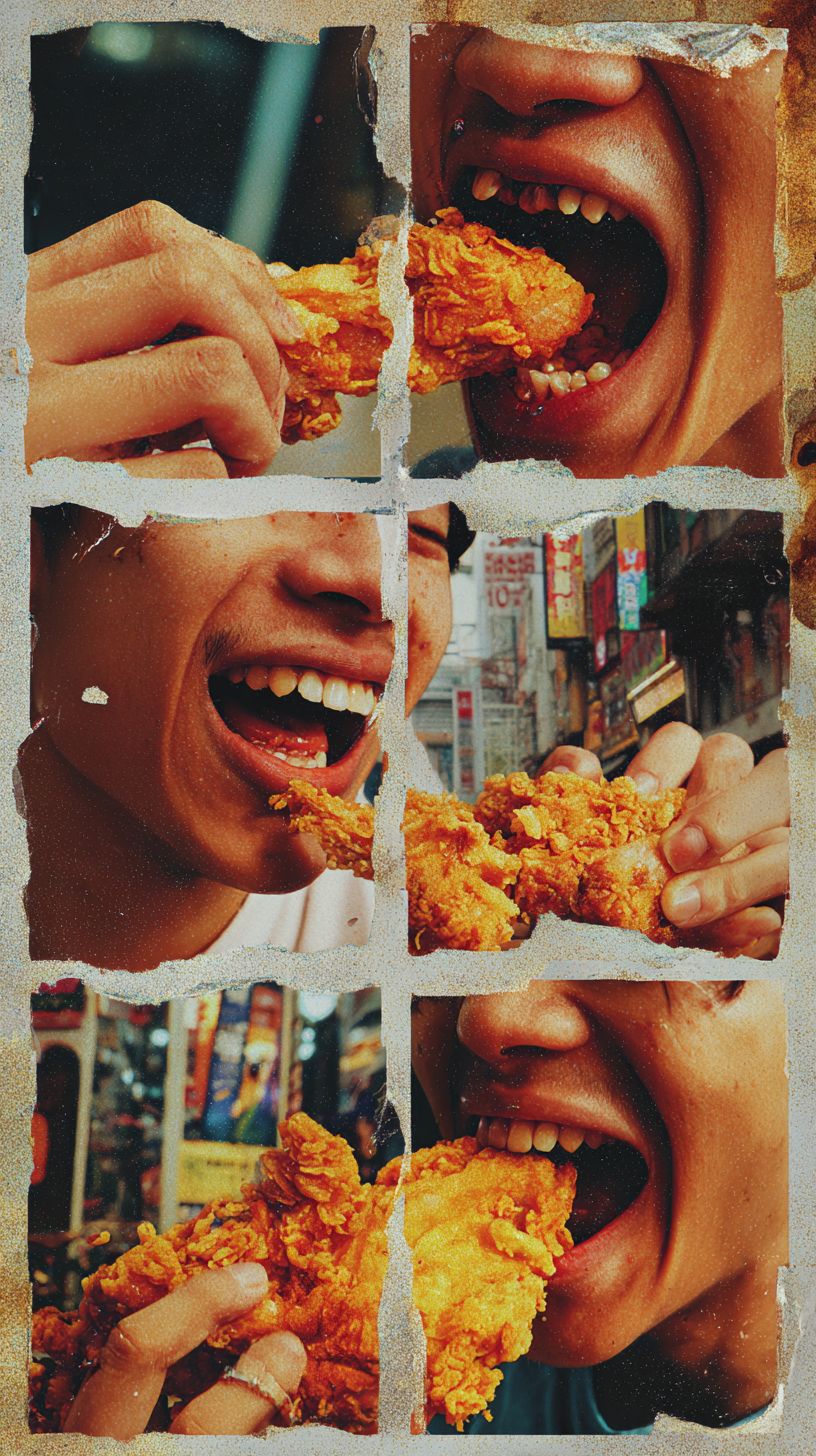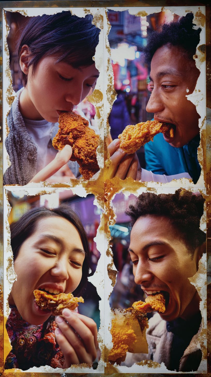 Collage de papier déchiré en 4 cadres, chaque photo révélée par les bords de papier déchirés. Chaque cadre montre un étranger complètement différent savourant joyeusement du poulet frit croustillant avec des gros plans de bouchées croustillantes, des miettes dorées, des prises de vue centrées sur la bouche et des expressions uniques. Ambiance de rue branchée à Séoul, texture nostalgiques de la caméra à film, couleurs chaudes dorées-jaunes-rouges, grain doux, esthétique analogique. Bordures de papier déchiré réalistes séparant chaque cadre, texture déchirée organique, mise en page cohérente.