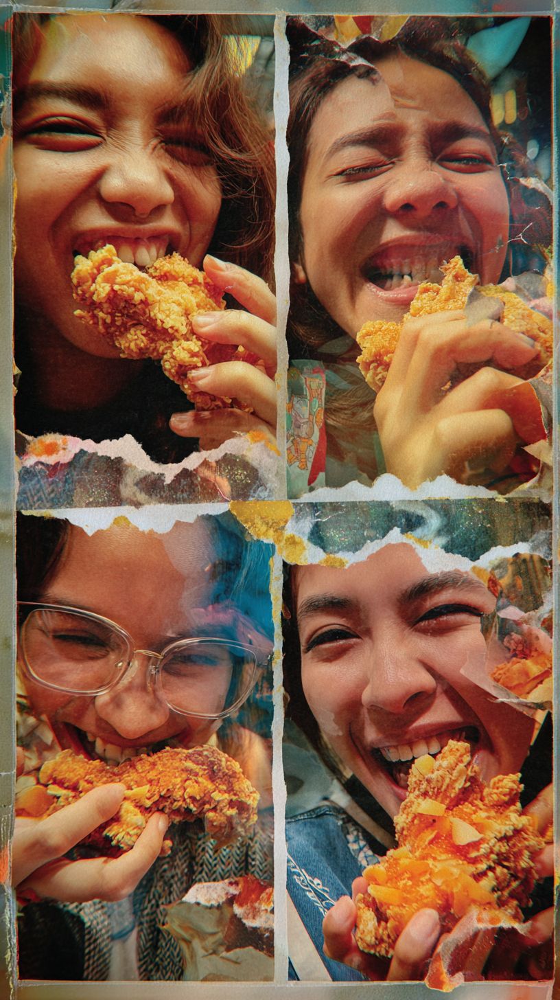 Quatre cadres montrent des étrangers appréciant joyeusement le poulet frit croustillant