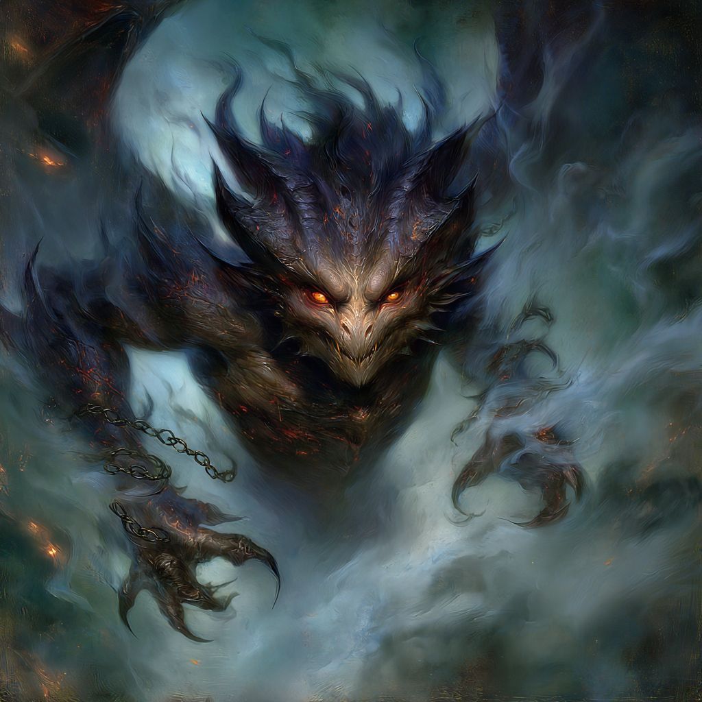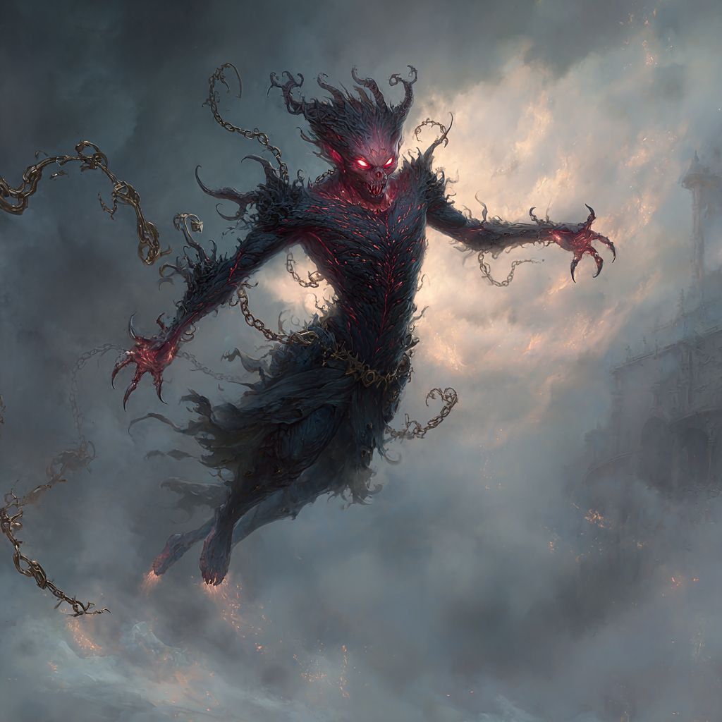 A small, wretched nightmare demon, hovering slightly above the ground, its form ethereal and partly made of shadows and mist. Its skin is smoky crimson-black, semi-transparent in places, with faint, flickering red veins that pulse softly with sinister magic. Tiny, curved horns sprout from its head, and wisps of shadow and smoke drift from its hair and limbs, flowing like restless smoke. Its glowing red eyes are unsettling but small and curious rather than terrifying, and delicate shadowy tendrils curl gently around its tiny body. Fragments of broken chains or faint embers hover around it, hinting at a mischievous, haunted origin. The environment is a muted, dreamlike nightmare realm, with soft drifting fog, flickering embers, and subtle warped shapes fading into darkness. Soft, cinematic lighting, highly detailed dark fantasy style, ethereal, eerie, haunting, but small and harmless compared to larger infernal beings. --profile ndjdnui uv5qmyu --v 7.0