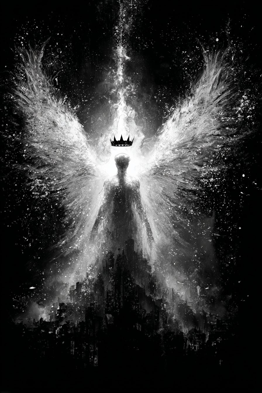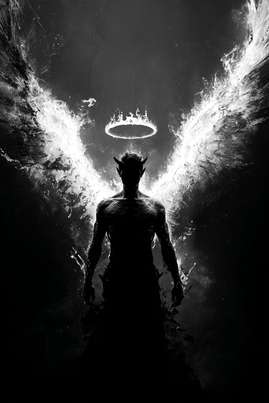 A black and white minimalist book cover featuring Lucifer as a powerful, ethereal figure made of radiant white light standing against a vast black void. His wings are immense but tattered, formed of smoke and ash rather than feathers. A shattered crown floats above his head, half aflame. Behind him, the faint outline of a ruined Heaven crumbles into darkness. Strong contrast, high drama, cosmic and gothic atmosphere, no text on the image. Symbolic composition emphasizing rebellion, sacrifice, and tragic nobility. --ar 2:3 --v 7.0