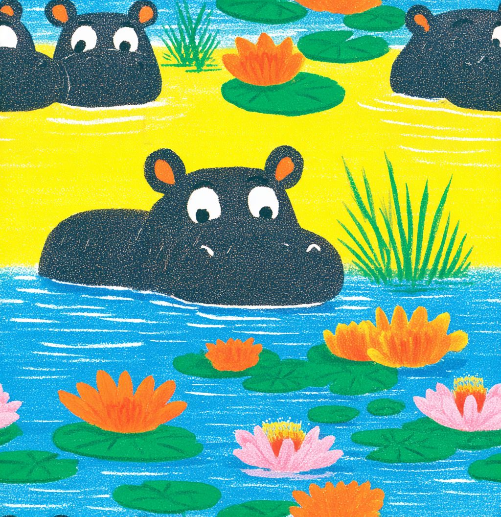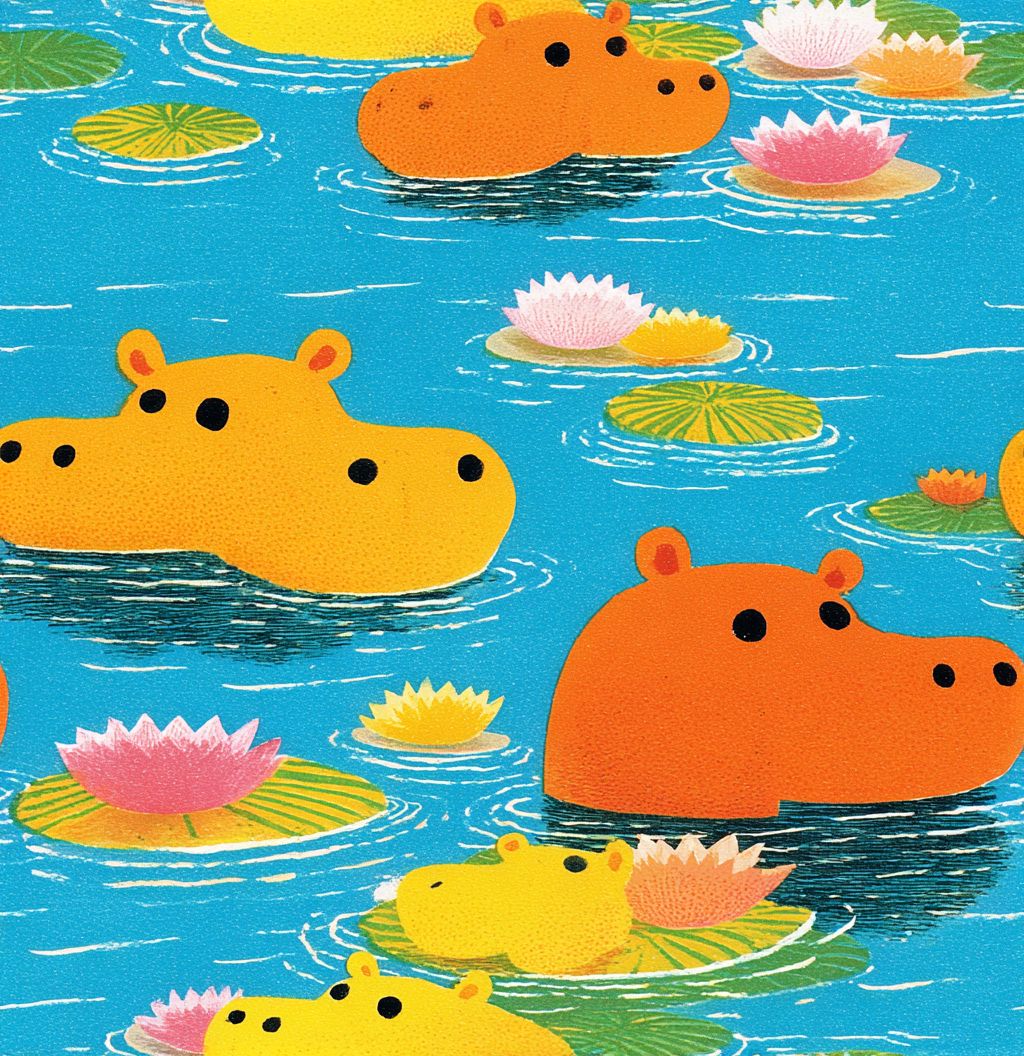 a seamless pattern of cute baby hippopotamuses swimming in the water, surrounded by lily pads, with gentle ripples and pastel colors. the background is a tranquil turquoise blue, creating an atmosphere of calmness and serenity. soft lighting enhances the cuteness of these adorable animals, making it suitable for children's book illustrations or fabric designs, in a cartoon style. --ar 28:29 --tile --sref 1891486251 --v 7.0