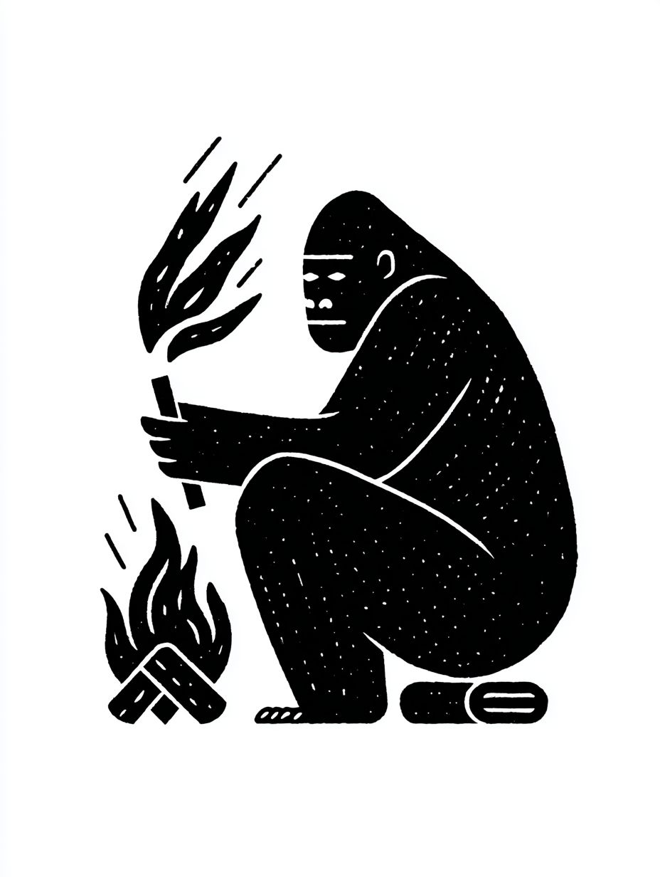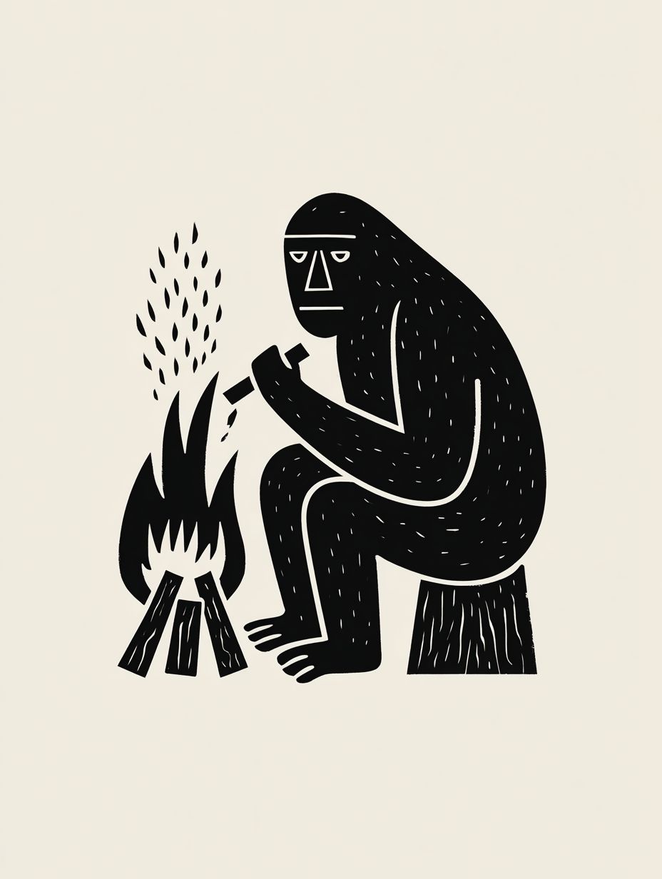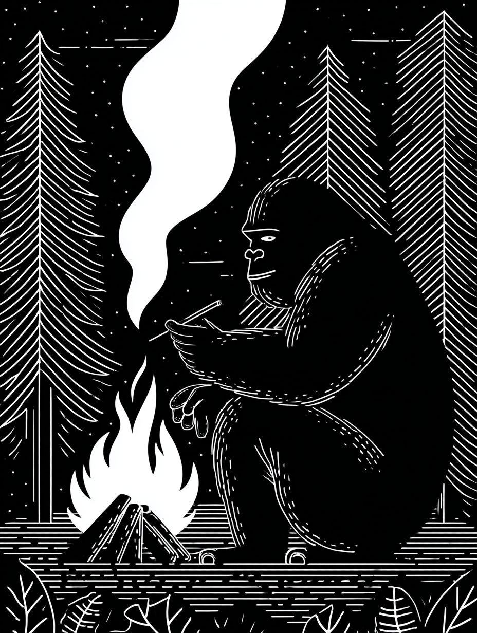 An abstract linoprint of a Sasquatch sitting by a campfire whittling on a wood stick, sparks flying out from the fire. The Sasquatch has eyes that feel human, sincereness, in a trendy, minimal style. Black silhouette. Hand-drawn design for a logo that is dynamic and visually interesting. --ar 3:4 --raw --profile aoykn6g --v 7.0