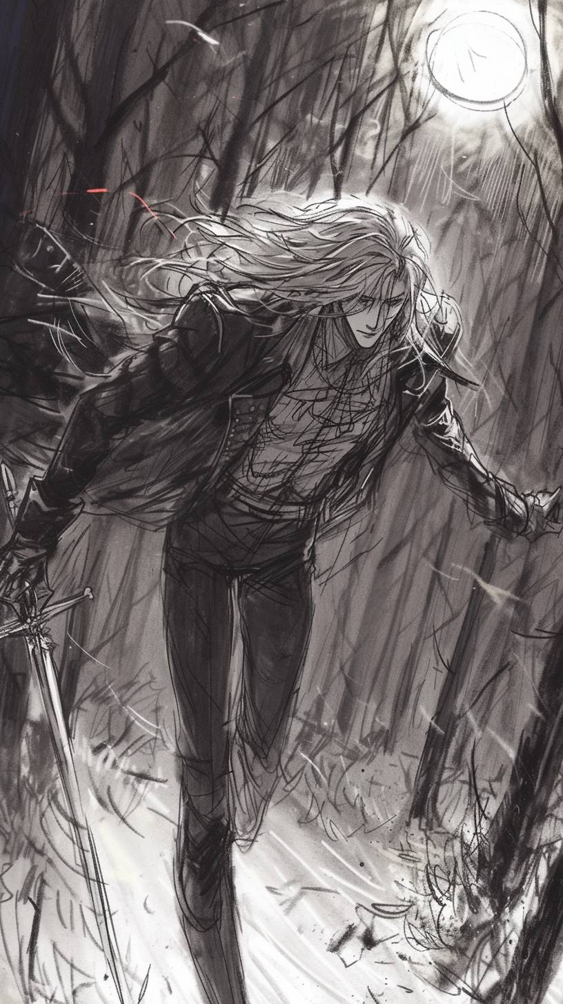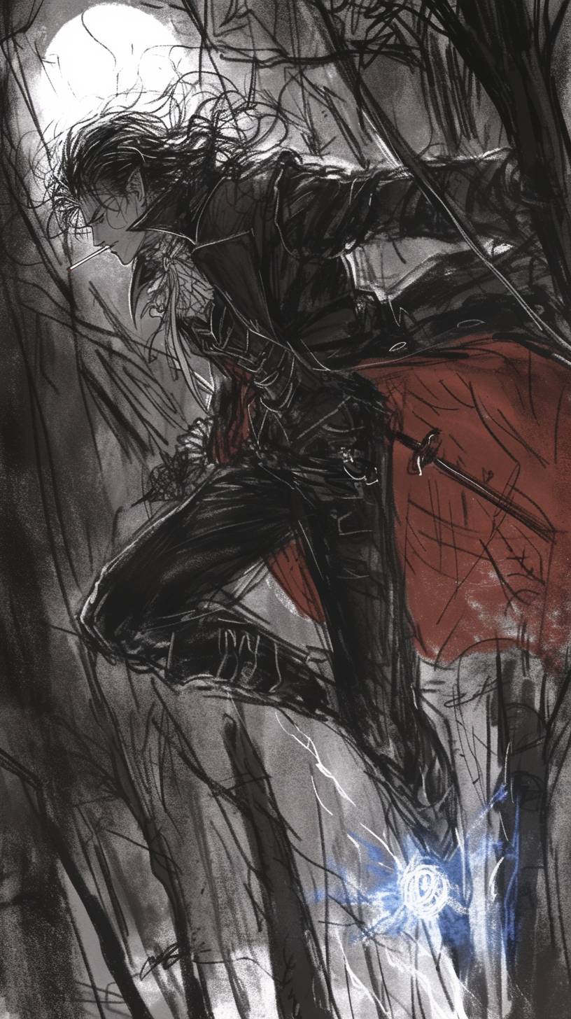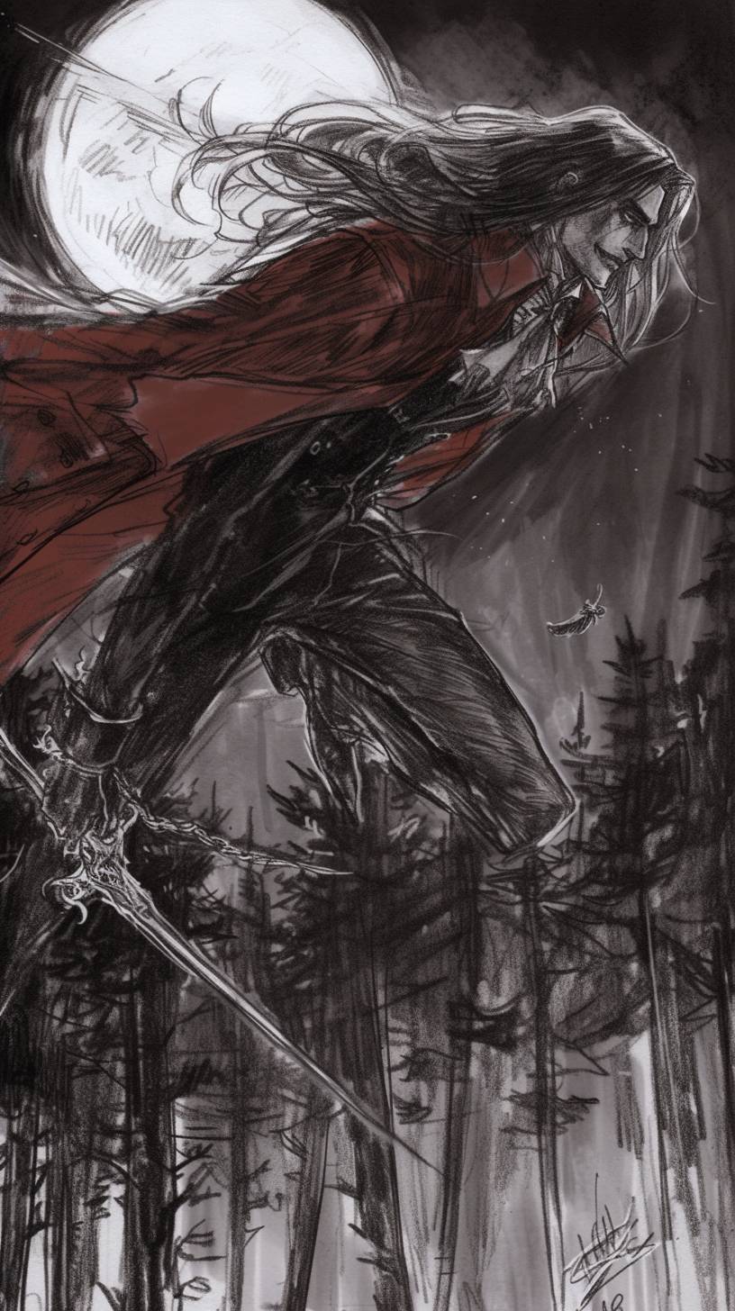 Alucard vole au-dessus d'une forêt la nuit, avec la pleine lune qui se lève, tenant son épée magique.