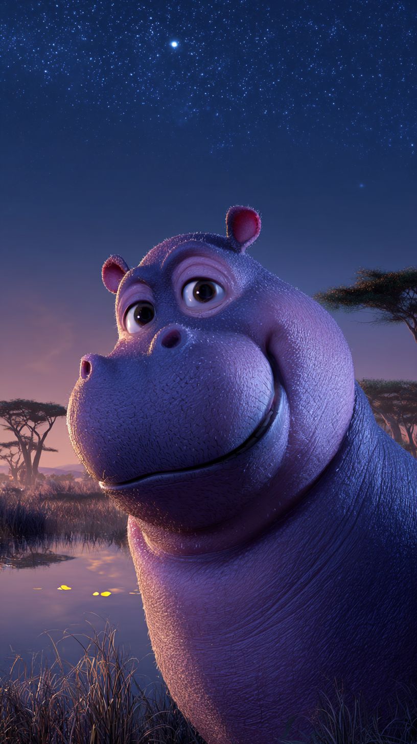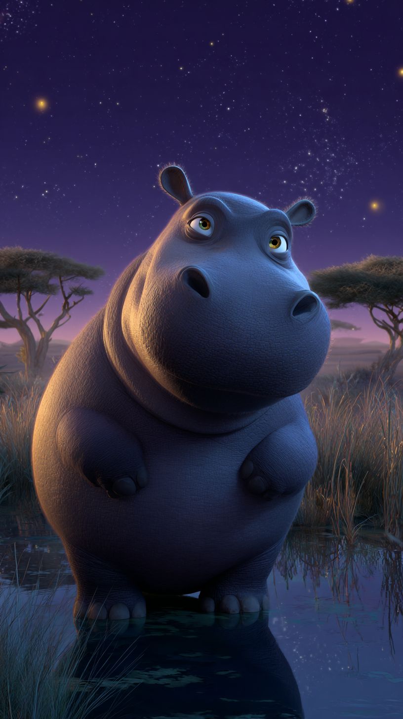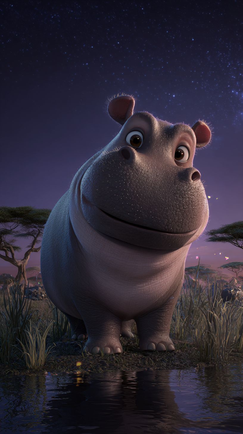 Portrait de personnage 3D style Pixar d'un hippopotame adorable avec un grand sourire chaleureux et des yeux expressifs, se tenant près d'un trou d'eau tranquille dans la savane la nuit. Douce lumière de lune soulignant le visage rond et les oreilles, doux reflets scintillant sur l'eau, silhouettes d'herbe haute, arbres d'acacia éloignés, quelques lucioles brillantes, ciel étoilé avec une faible Voie lactée. Proportions héroïques mignonnes, peau stylisée lisse avec une texture subtile, éclairage cinématographique, faible profondeur de champ, rendu de film d'animation de haute qualité, ambiance amicale et saine. Pas de texte, pas de logos, pas de filigrane.