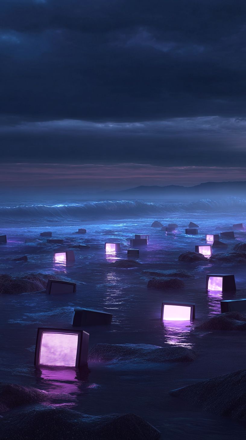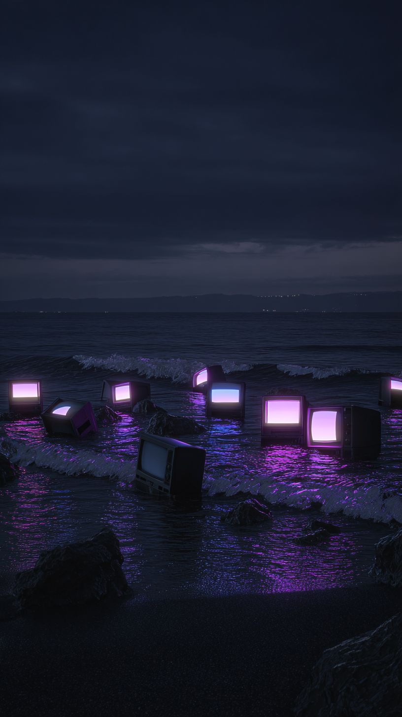 Paysage maritime liminal surréaliste la nuit, des dizaines de téléviseurs CRT vintage partiellement immergés dans des eaux océaniques peu profondes, de vieux téléviseurs éparpillés sur le rivage et les vagues, une douce lumière rose et violette émanant des écrans de télévision, des vagues douces réfléchissant des reflets néon roses et bleus, un océan sombre et calme, un horizon lointain, un ciel nocturne nuageux, une atmosphère cinématographique, du sable humide, des reflets subtils, une physique de l'eau réaliste, un noyau de rêve, un espace liminal, étrangement familier, calme, étrange, ambiance nostalgique, réalisme cinématographique, hyper détaillé, brume douce, faible contraste, dégradés lisses, pas de personnes, pas de texte, pas de logos, photoréaliste, haute résolution, pris avec un appareil photo plein format, objectif de 35 mm, profondeur de champ naturelle, photographie en faible luminosité, ombres bleu profond, noirs atténués, atmosphère froide, mises en évidence minimales