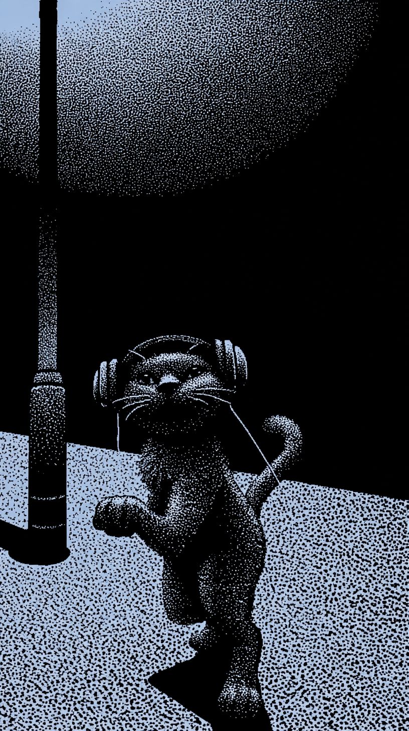 Un chat anthropomorphique à poils courts portant des écouteurs, avec un pelage brillant et texturé. Marchant sous un lampadaire. Rendu dans un style illustratif de livre d'histoires dimensionnel présentant des surfaces textiles douces, des formes géométriques simplifiées et un minimalisme expressif. Vue panoramique. Ton noir bleuâtre.