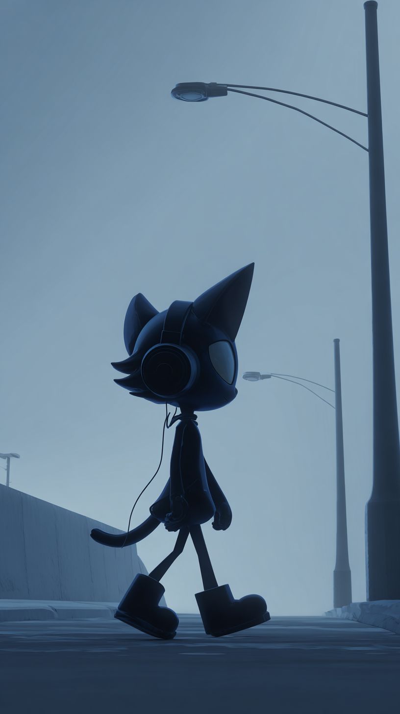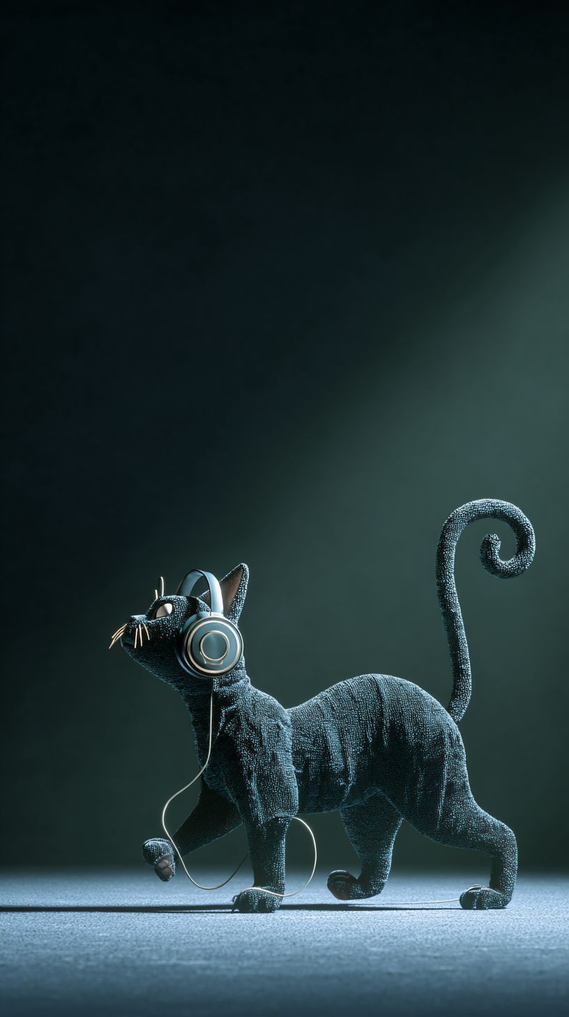 Shorthair anthropomorphic cat wearing headphones, with glossy textured fur. Walking under a streetlight. Rendered in dimensional storybook illustration style featuring soft textile surfaces, simplified geometric forms, and expressive minimalism. Panoramic view. black dark bluish tone --chaos 10 --ar 9:16 --s 50 --raw