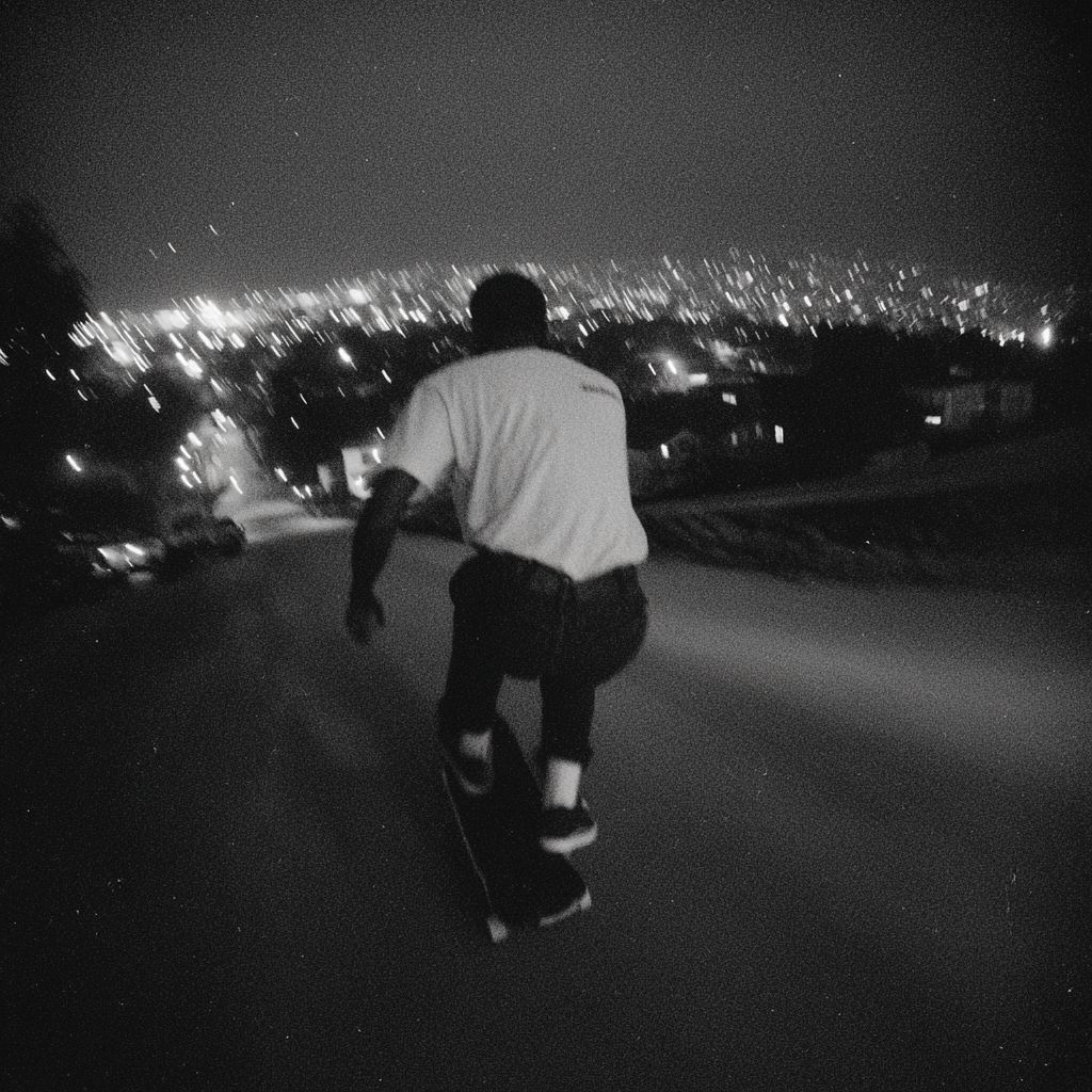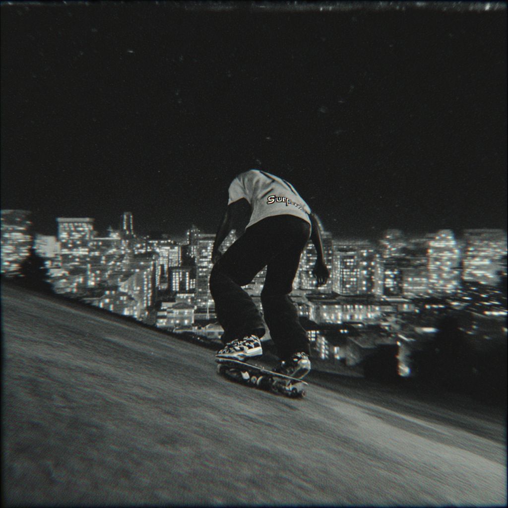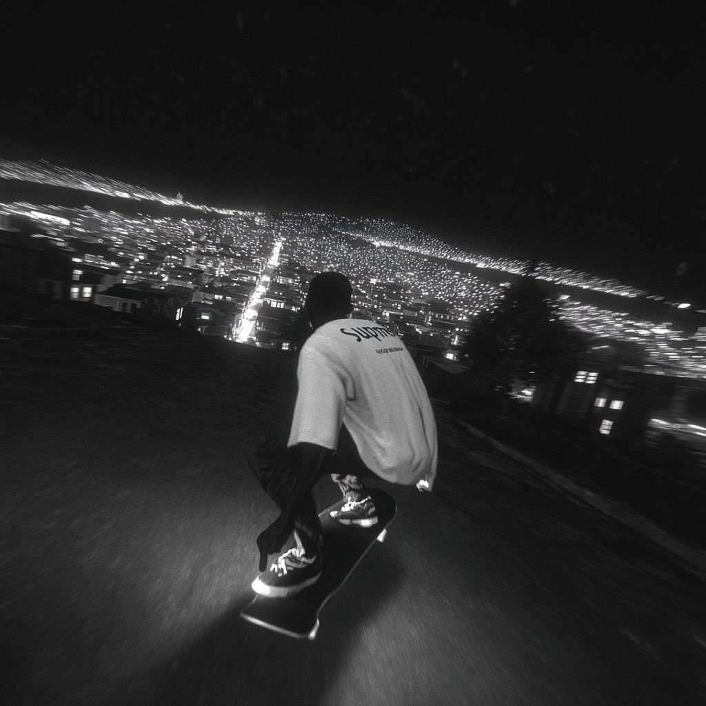 cinematic, third person pov, video game angle, a black man skateboarding down a hill in night time san francisco, supreme, mid 90s aesthetic, grainy, black and white, punk, vans warped tour, cityscape in background --s 50 --raw