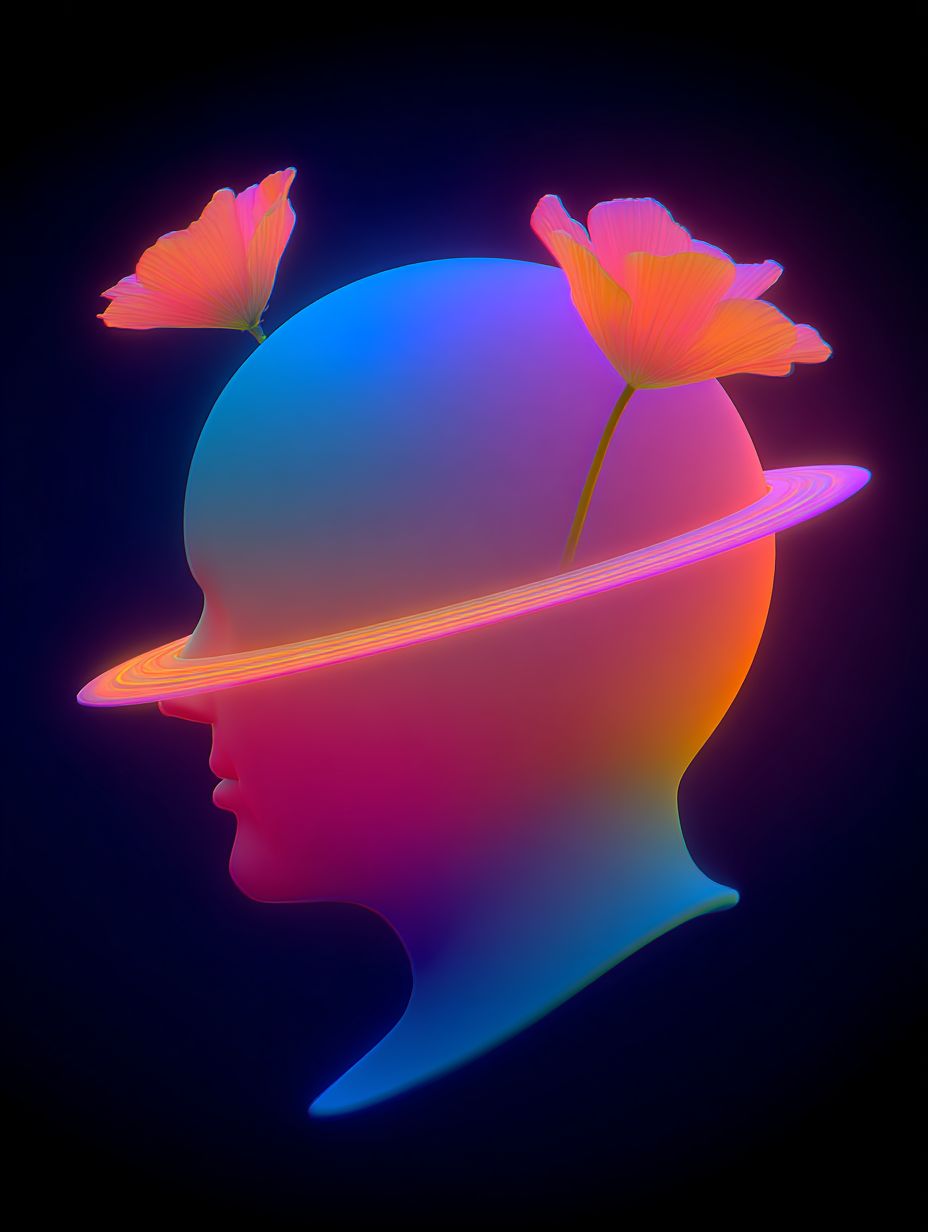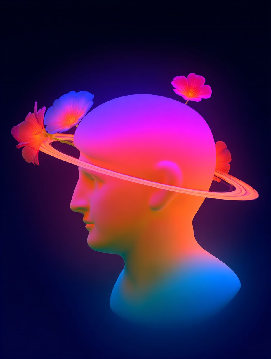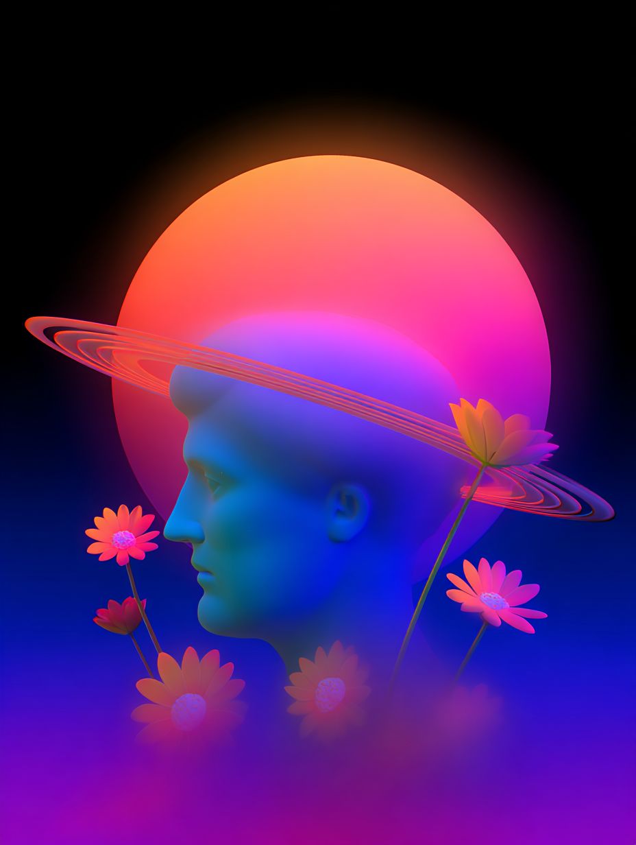 a planet in outer space, with some giant flowers growing out of the planet and reaching into space. But the planet is actually a giant greek sculpture-style human head with rings around it --ar 3:4 --sref 831583378 --profile mwle9l2 --s 50 --raw