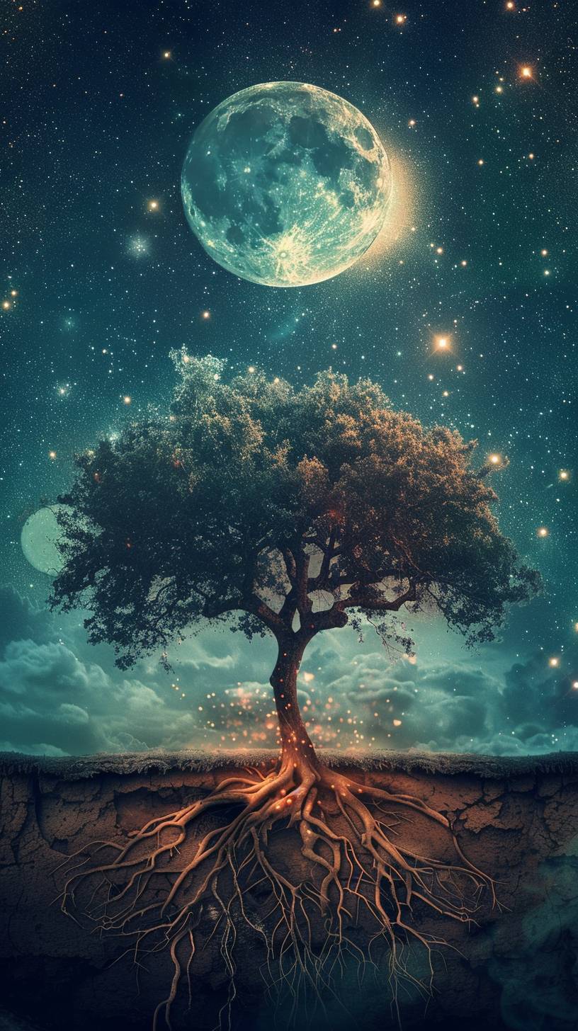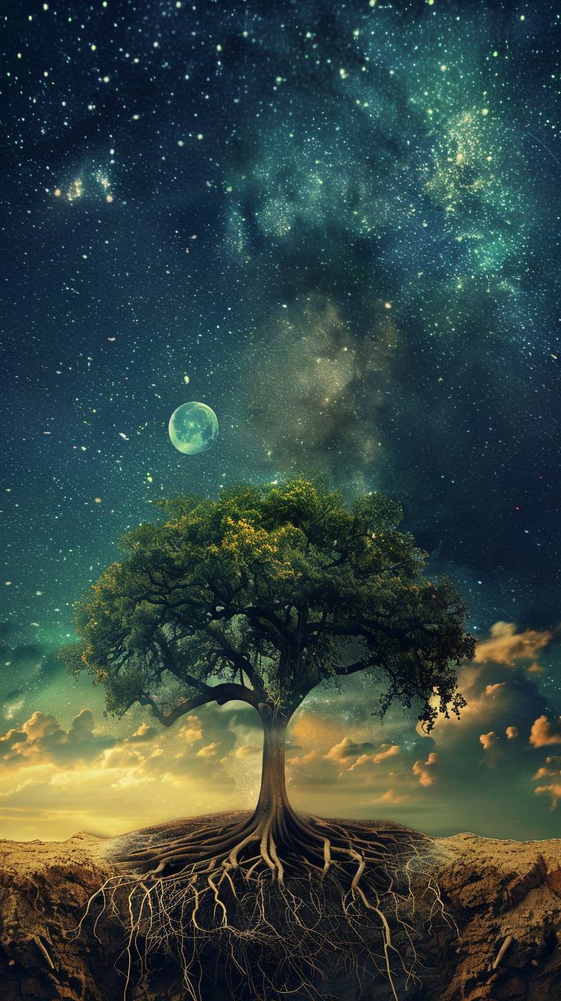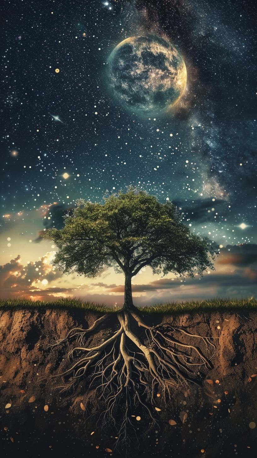 Un bel arbre poussant avec des racines dans le sol, des étoiles et la lune dans le ciel.