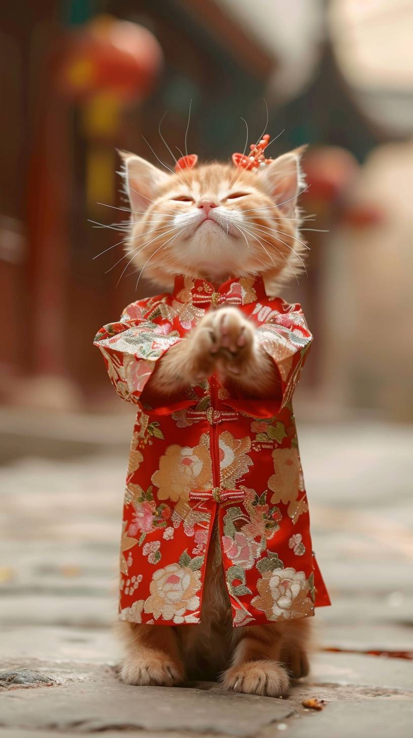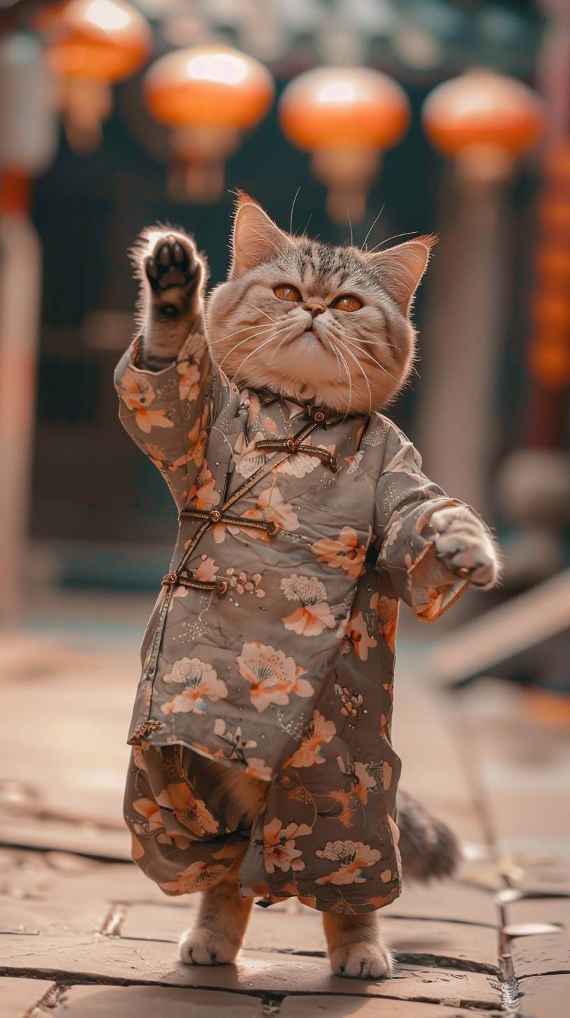 Un chat humanoïde debout sur deux pattes souriant à la caméra, portant des robes chinoises pour femmes, arrière-plan flou, vidéo provenant de TikTok.