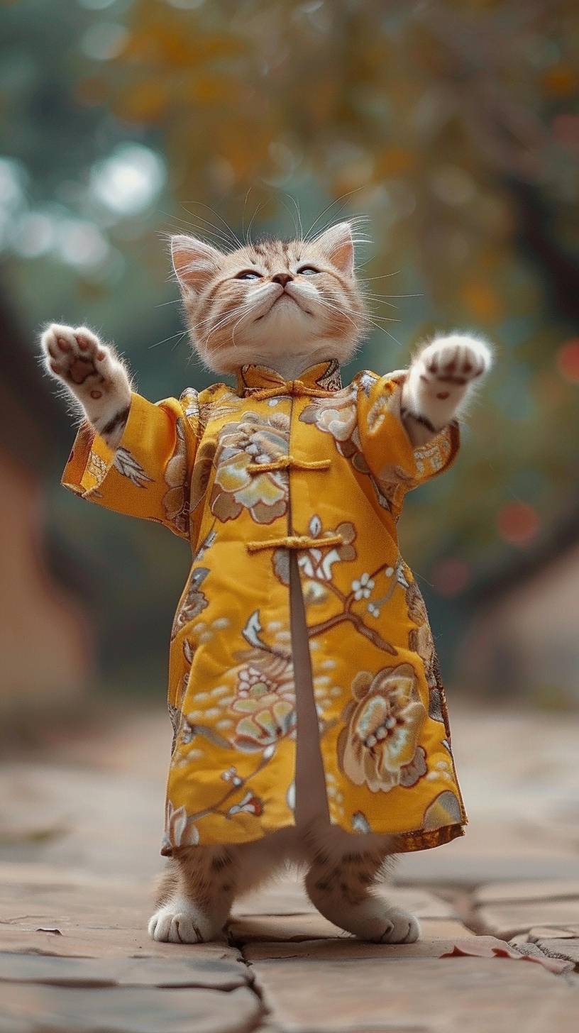 Un chat humanoïde, debout sur deux pieds et souriant à la caméra, photo en pleine longueur, robes chinoises pour femmes, très drôle, pose debout, l'arrière-plan est assez flou, l'arrière-plan est très brumeux, séquences vidéo de TikTok.