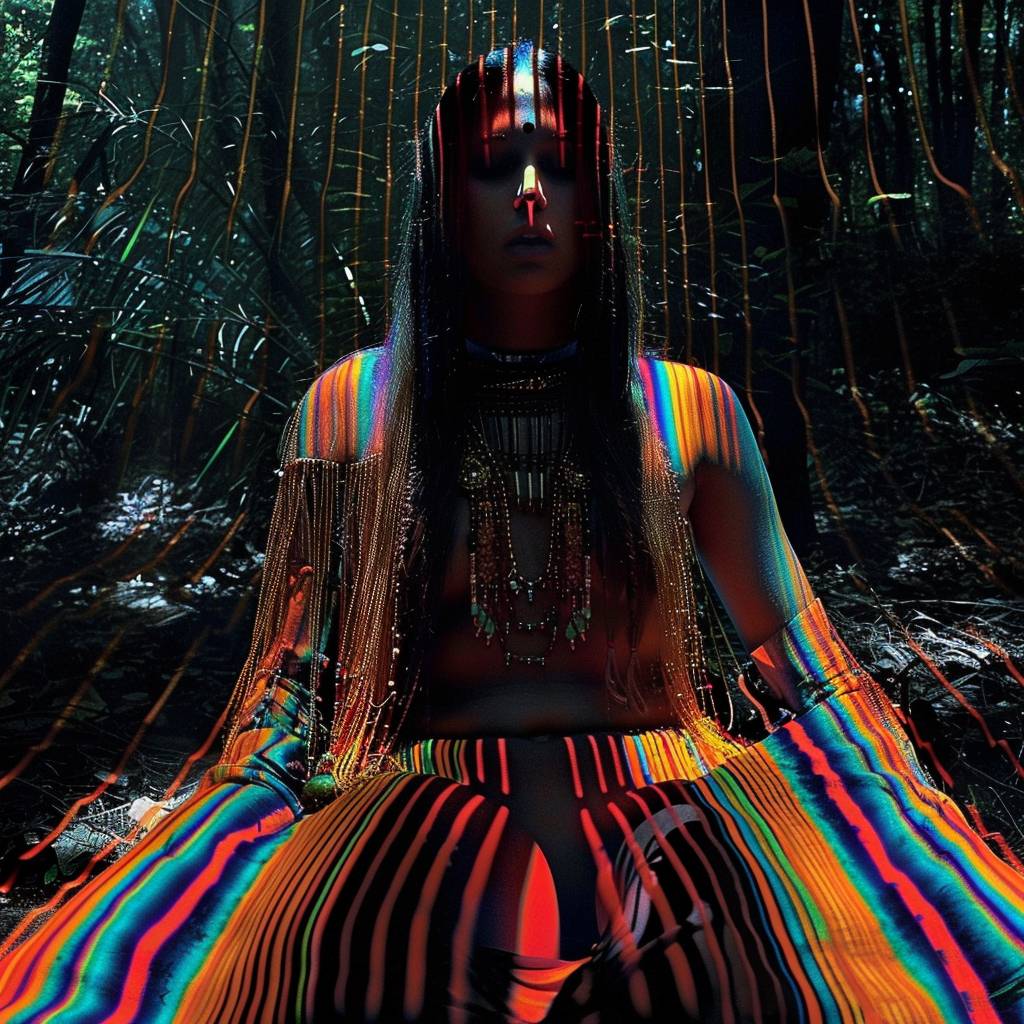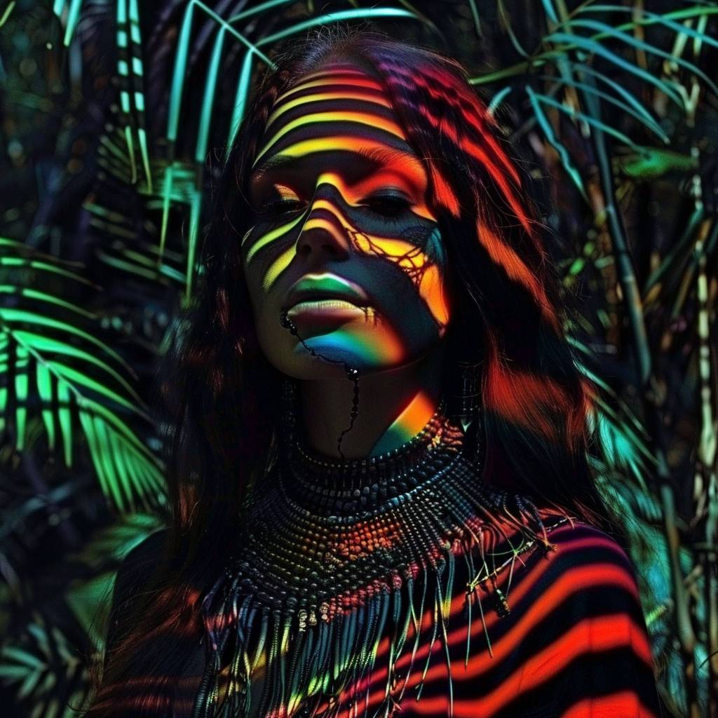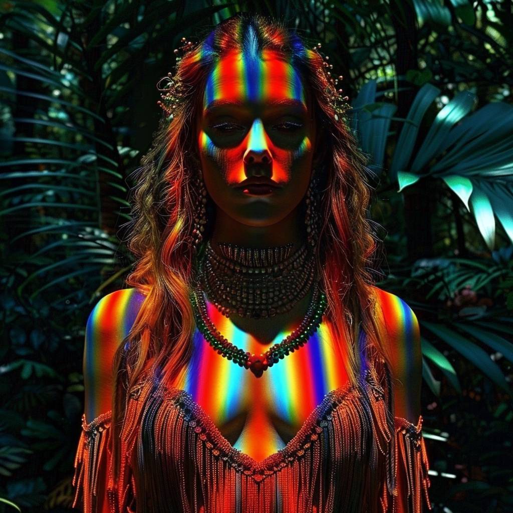 Boho-chic fashion shoot in a lush garden, with a model dressed in layered bohemian outfits, accessories with fringe and beads, captured in natural sunlight filtering through the trees, creating enchanting light and shadow play, natural skin texture, resembling magazine photography, soft focus, ultra detailed, (acid rain:1.4) --sref 4111512992 --v 6.0