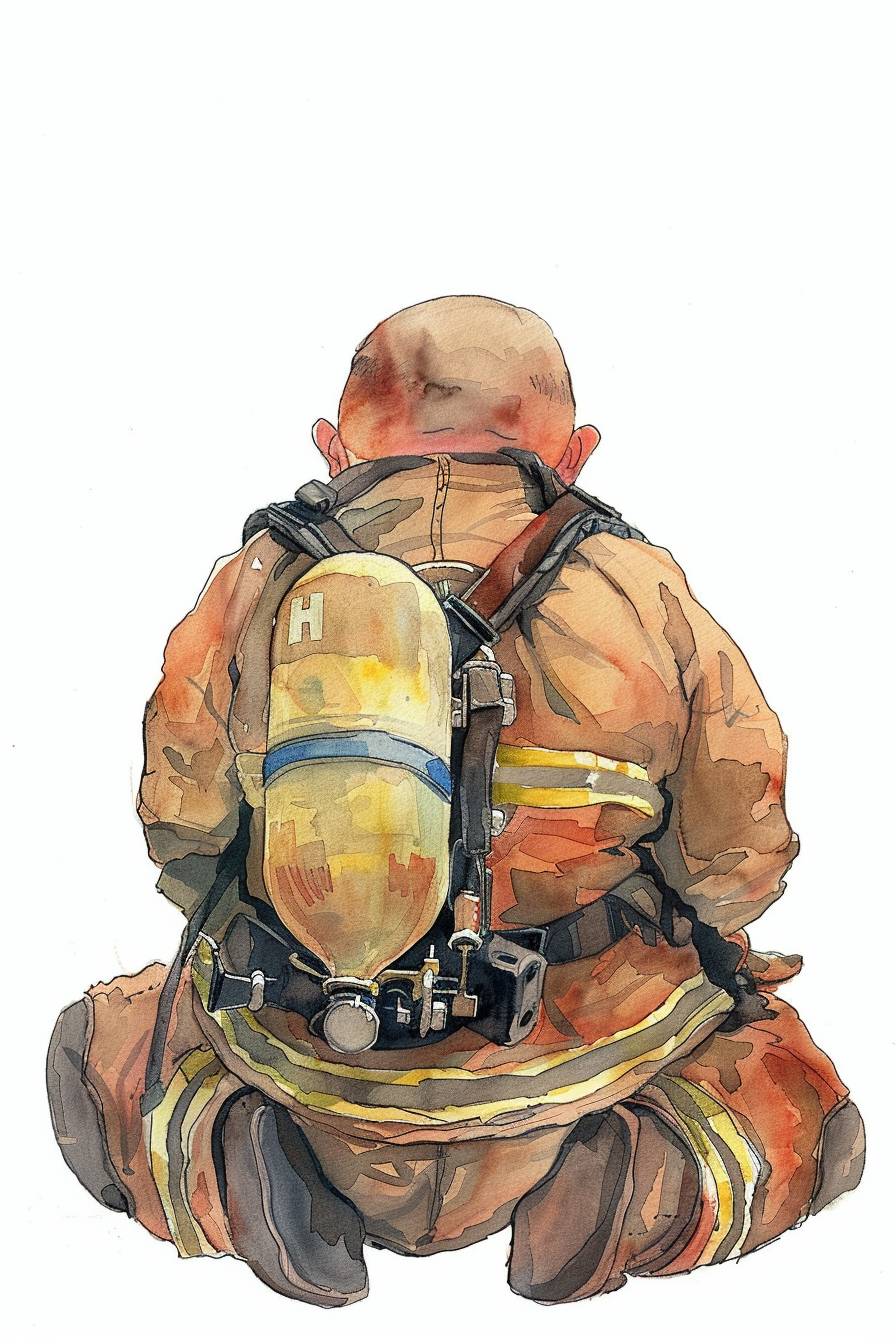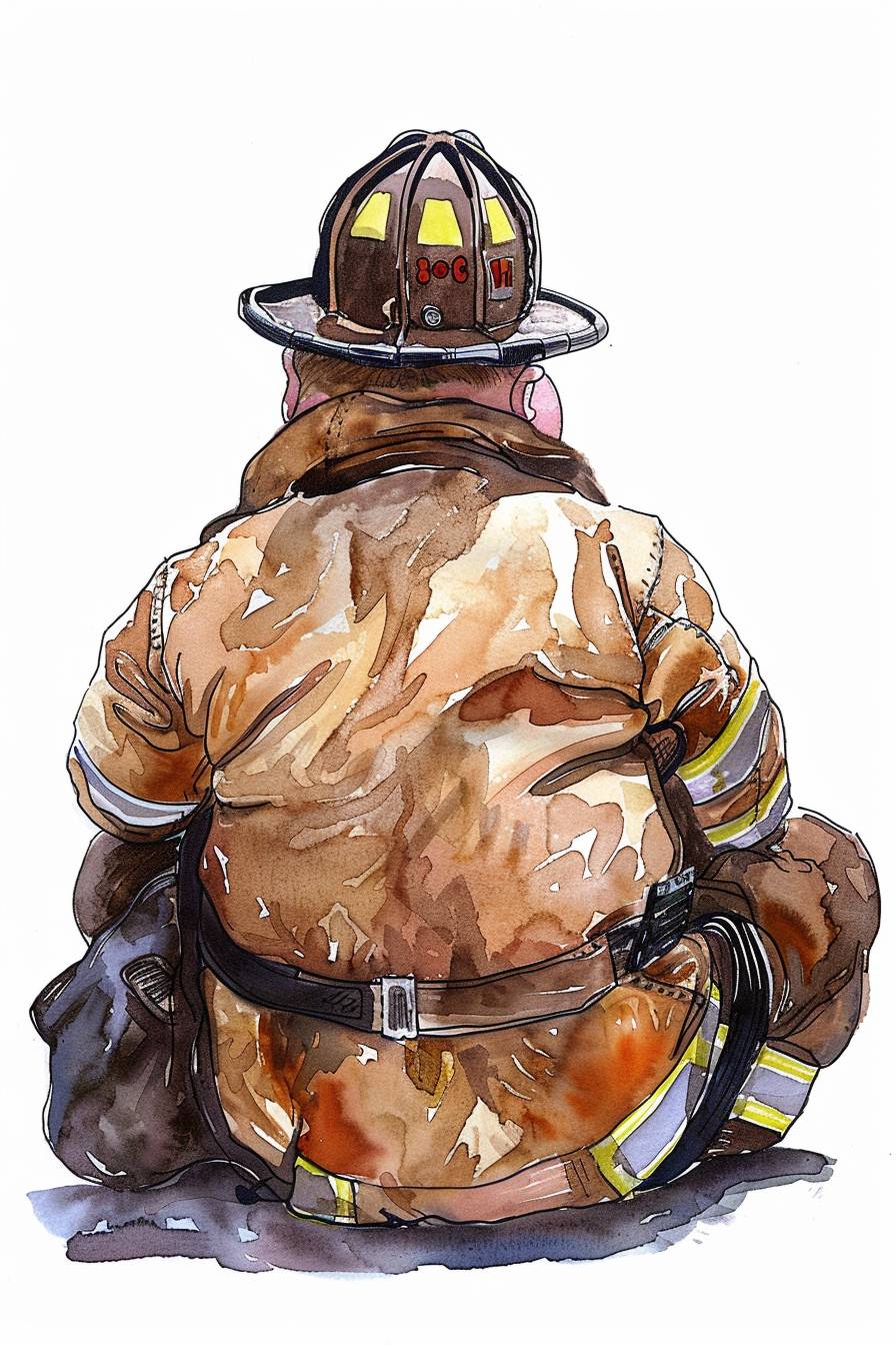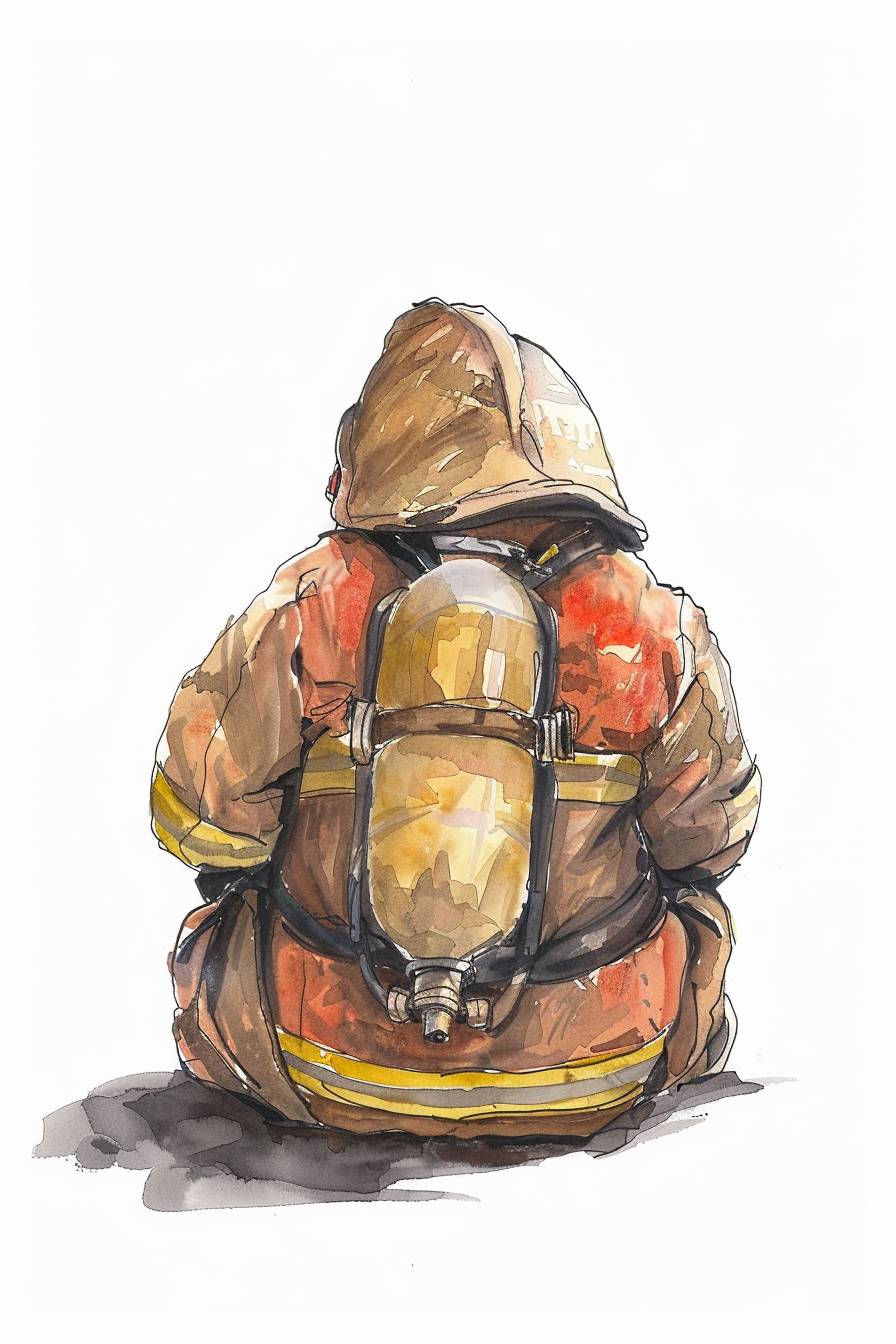 Watercolor sketch illustration of the back of a baby fire fighter sitting down digital art, concept, in the style of rifle paper and co, in the style of pixar, fat fire fighter, art, 8k, hd, high detail illustration, isolated on a white background --no background --ar 2:3 --v 6.0