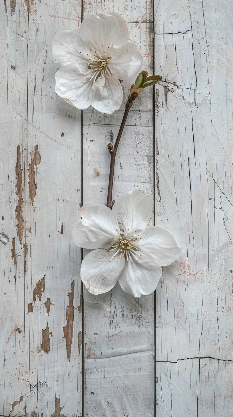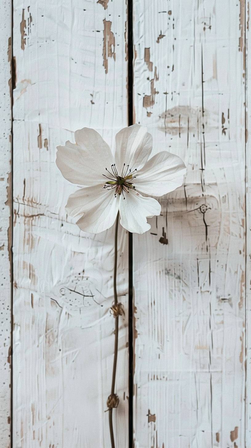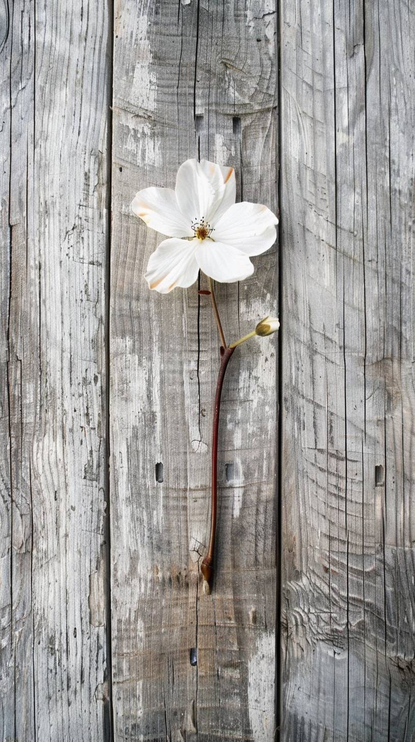 Bois blanc rustique avec perspective et fleurs minimalistes