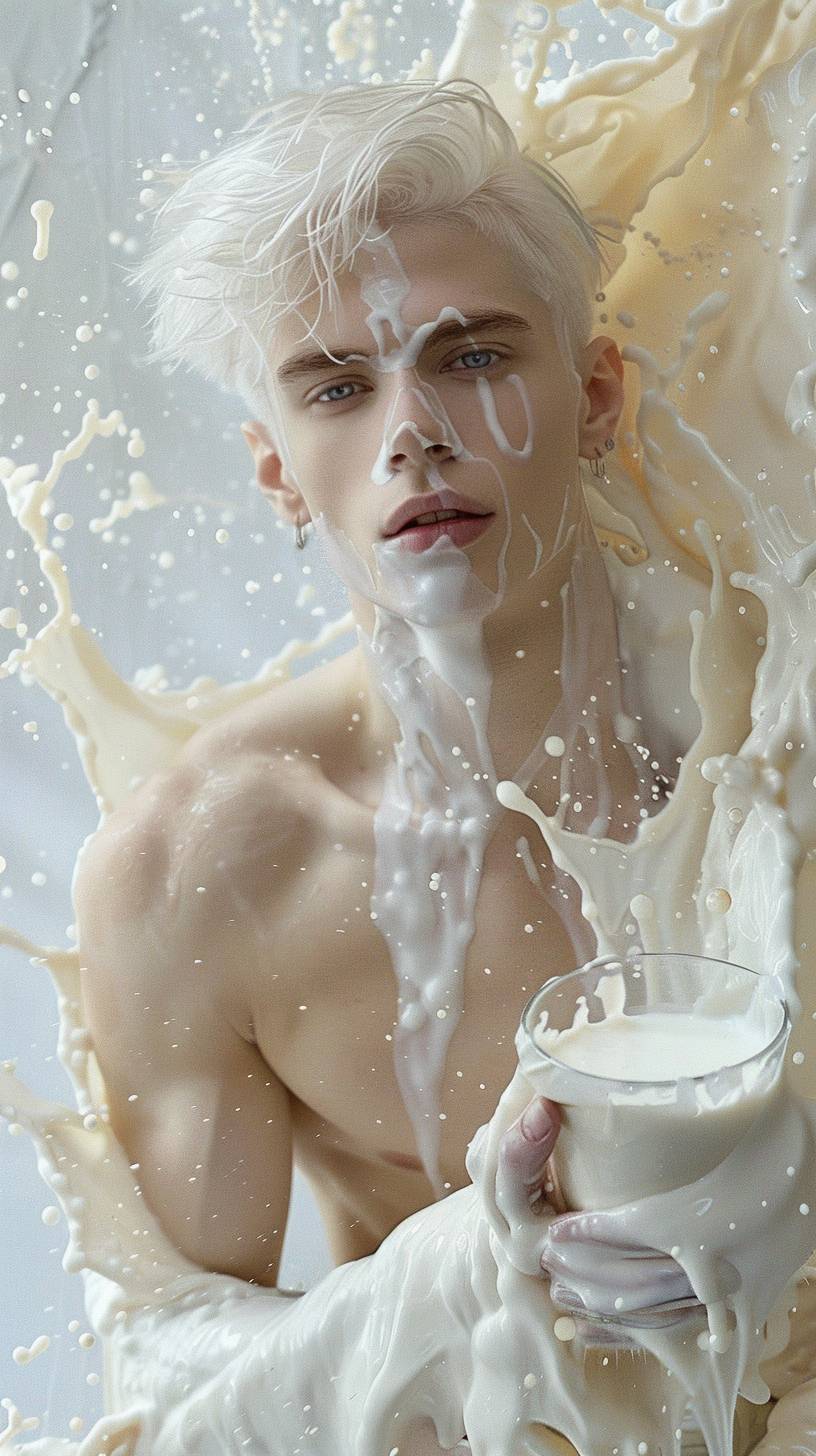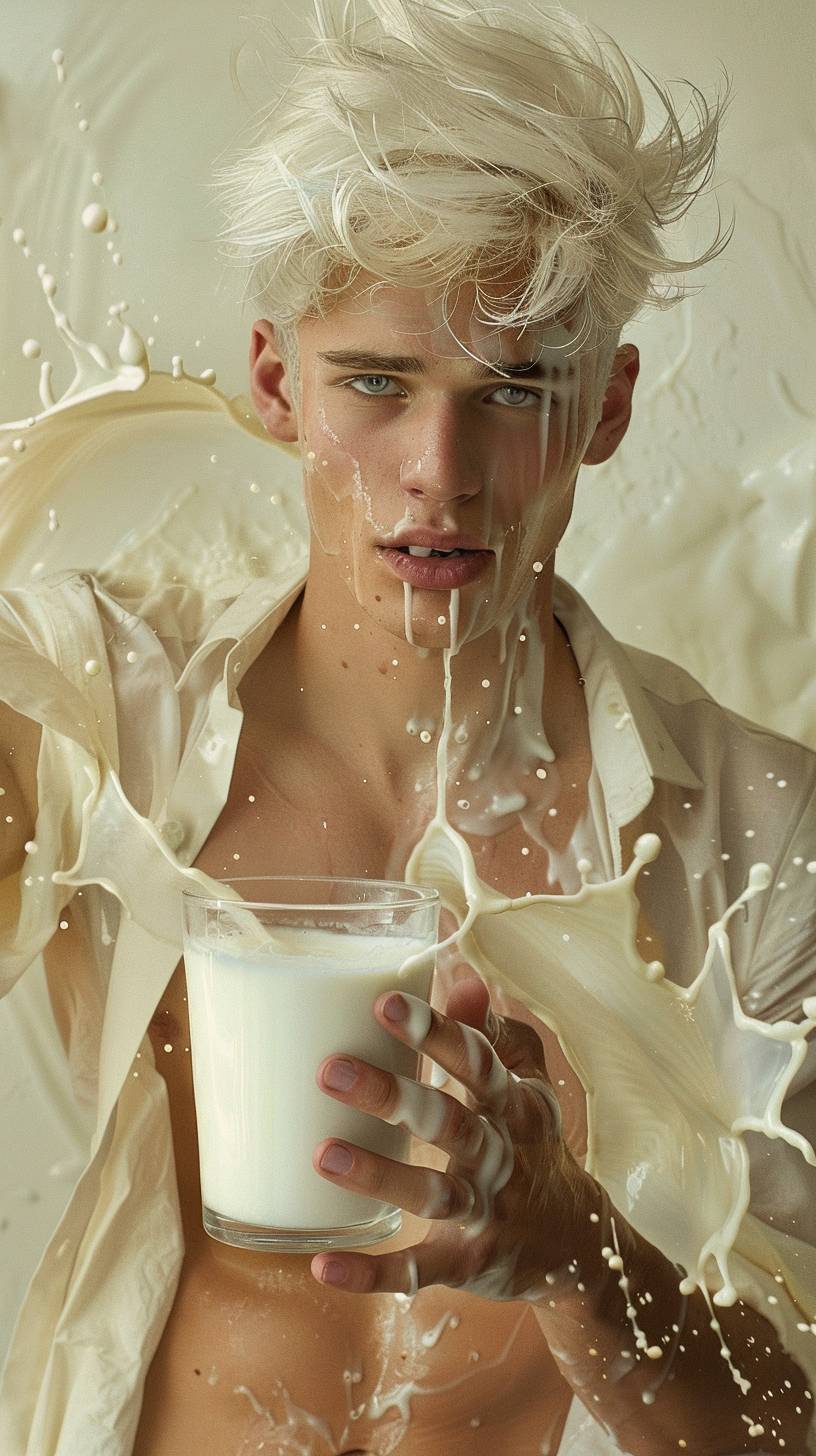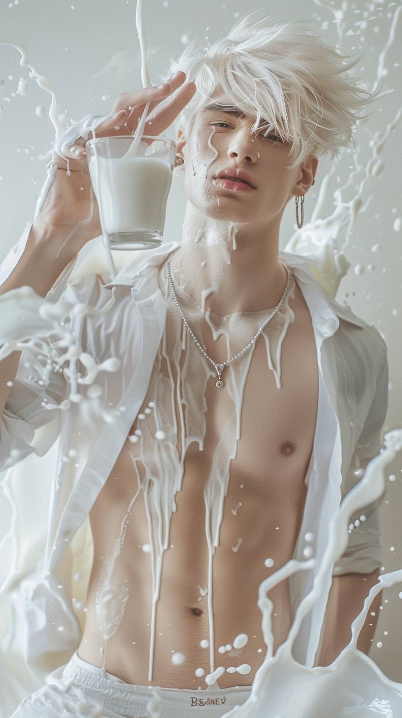 iPhone shooting, real photo, perfect face detail,a handsome European man, Perfect abs, Full body shot, gentle neat hair, white skin, A personified version of plain milk. Imagine a serene, elegant young man with flowing white hair styled in a modern cut, wearing an open white shirt that reveals his abs and muscular build. He has a calm, dreamy expression and is holding a glass of plain milk. His accessories and makeup reflect the milk theme, with pearl-like pins and a smooth, radiant complexion. The background features a soft, pastel white with flowing milk splashes, enhancing the milk-like feel. Milk is being splashed around him, adding a dynamic element to the scene --ar 9:16 --v 6.0