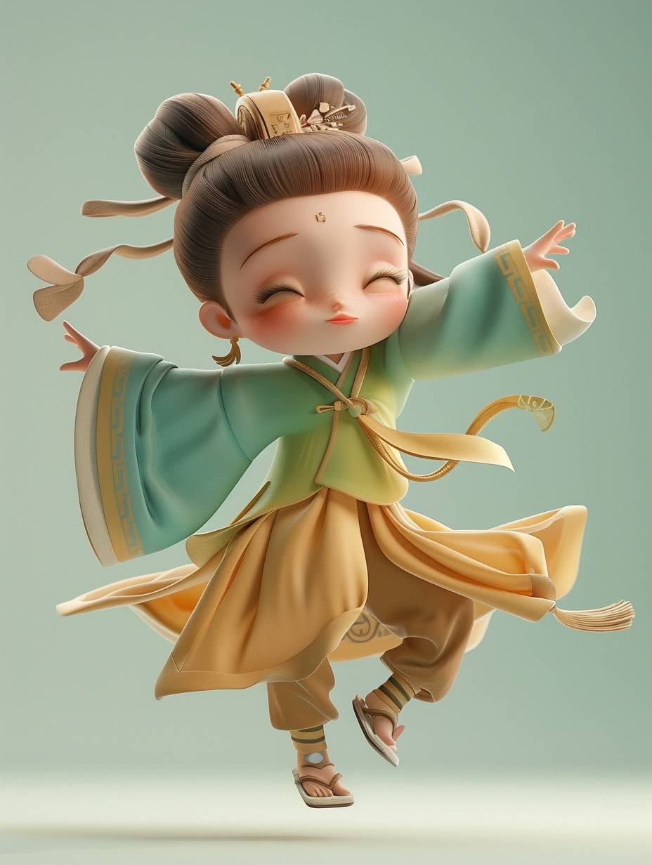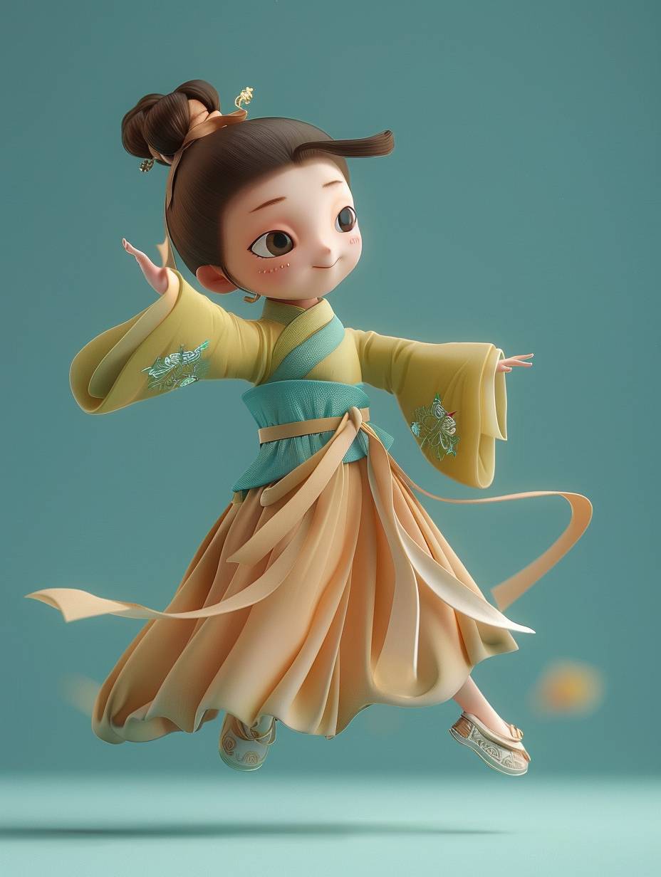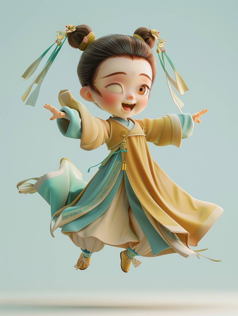 Rendu 3D, C4d, version cartoon Q, une petite fille de trois ans portant des vêtements d'été de la dynastie Tang, les cheveux attachés en chignon, portant de petites chaussures brodées, dansant dans les airs. Style Dunhuang, avec un fond bleu-vert et brun clair. Style chinois, diverses expressions et mouvements mignons, super exquis.