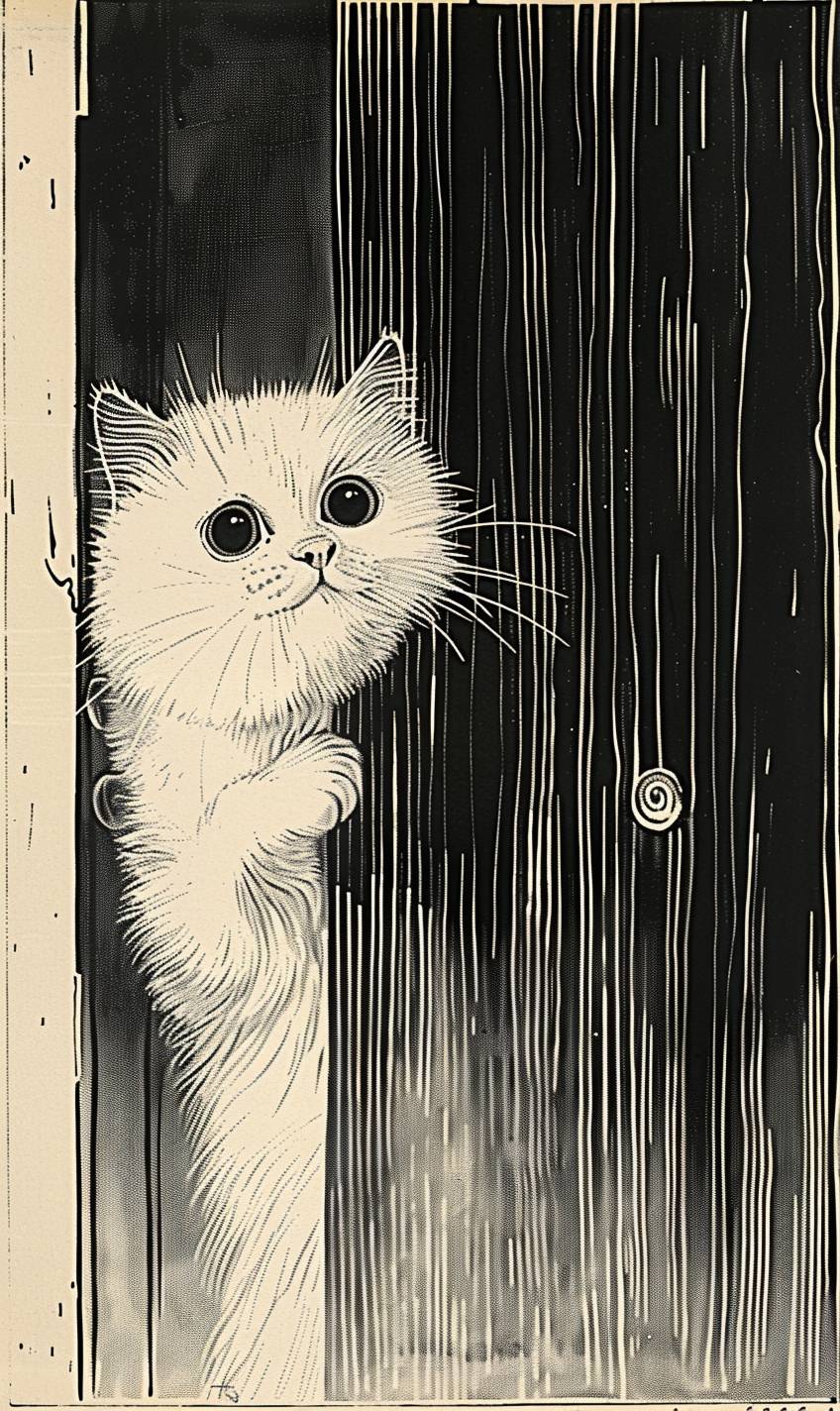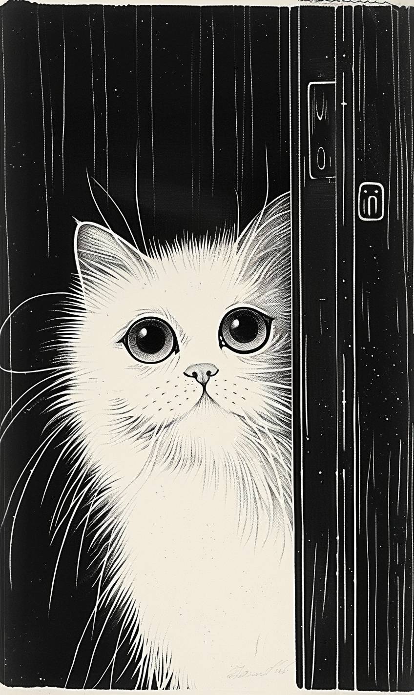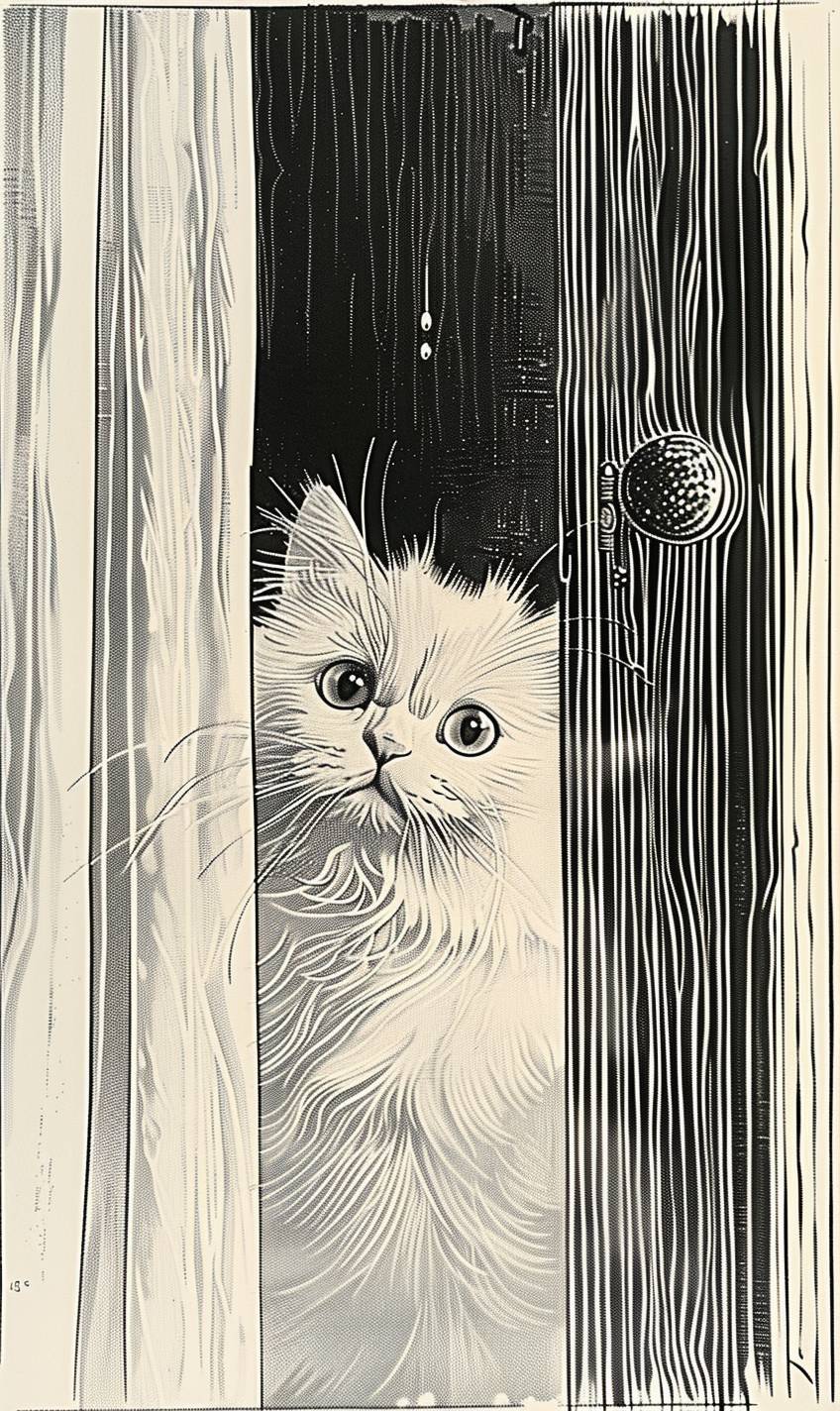 <https://s.mj.run/5chUtXXbMGs> Aubrey Vincent Beardsley A white, low-nosed, round-eyed Persian cat curiously peeking out of a fitting room with a long curtain,Henri de stippling art --ar 95:161 --v 6.0