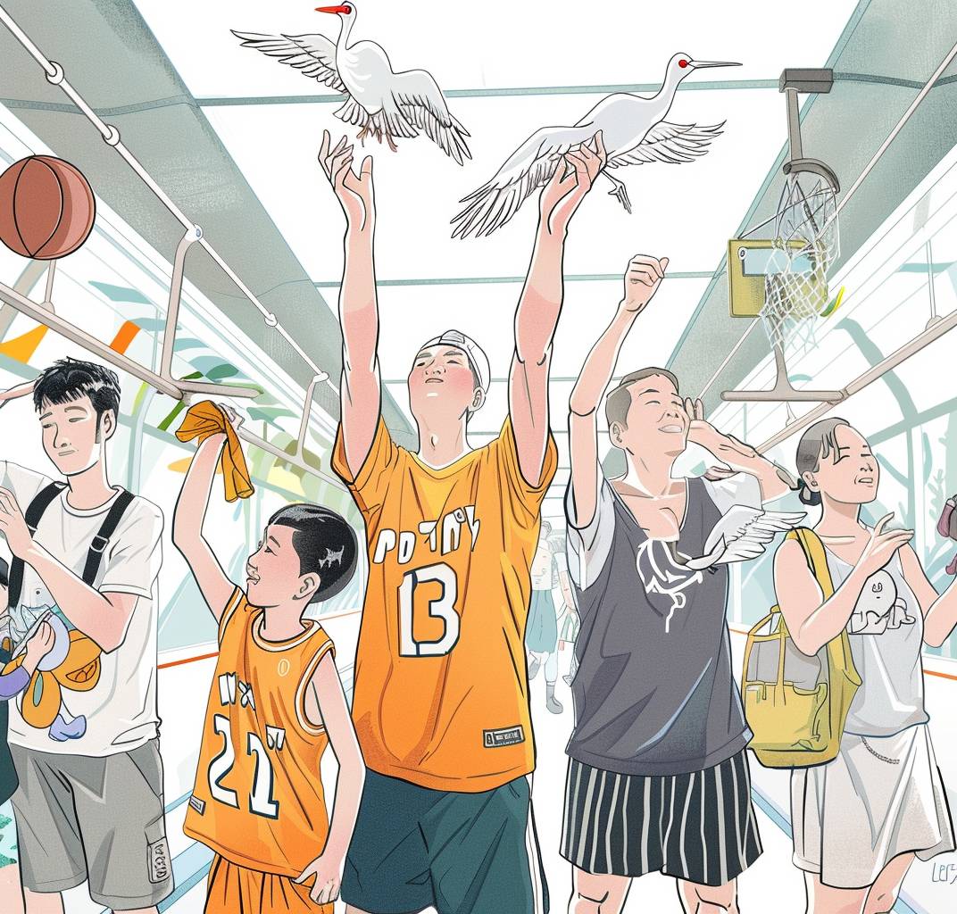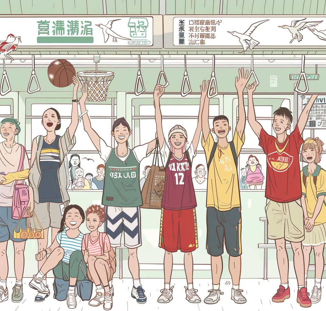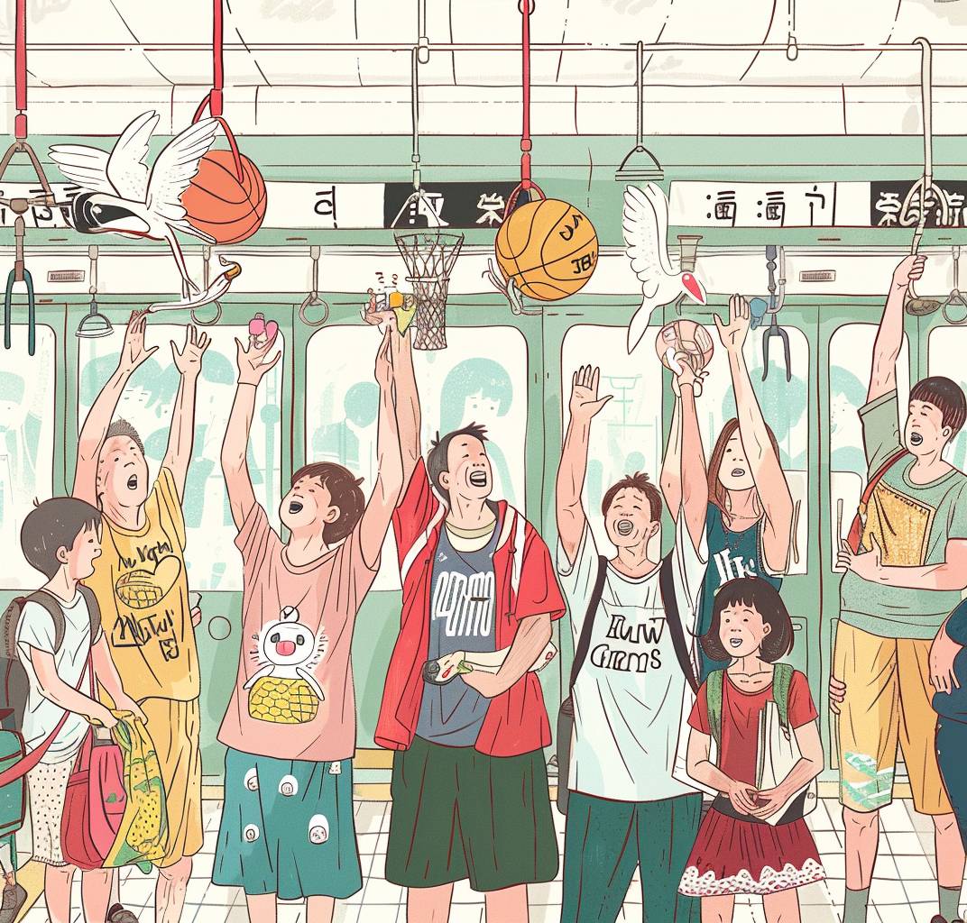 Dans le métro, des personnes asiatiques portent des maillots de basket et tiennent des grues les mains levées pour former des personnages de dessins animés. L'arrière-plan est blanc avec des lignes colorées représentant des scènes intérieures. Les illustrations dessinées à la main ont un style simple, avec des enfants tenant des équipements sportifs sur le côté gauche, des femmes en robes de chaque côté, des hommes debout, une vieille femme assise avec des sacs de courses à côté d'elle, des murs blancs et des fenêtres vertes, et des carreaux de sol gris.