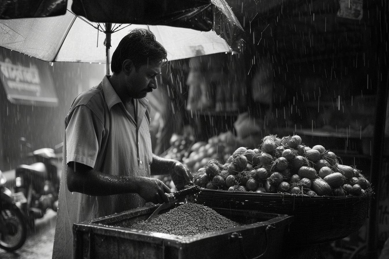 Un vendeur ambulant d'épices indien vendant ses marchandises sous la pluie, photographie noir et blanc, occlusion ambiante.