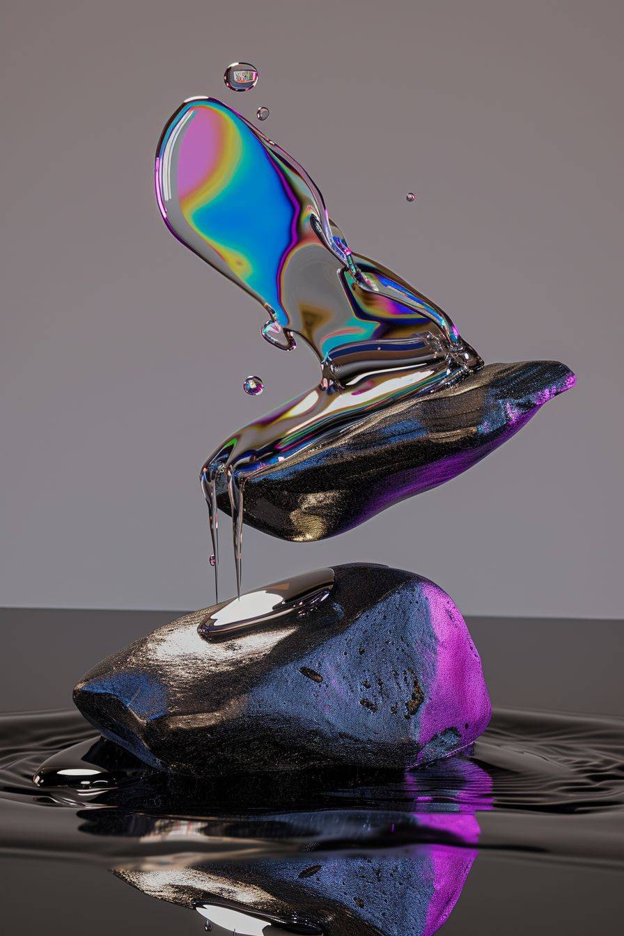 Argent liquide holographique vif s'échappant de la pierre, équilibre : pierre olive gris foncé craquelée flottant dans l'air, argent liquide holographique vif s'échappant de la pierre, dans le style de vray, traçage monotone, noir, dans le style de l'installation.
