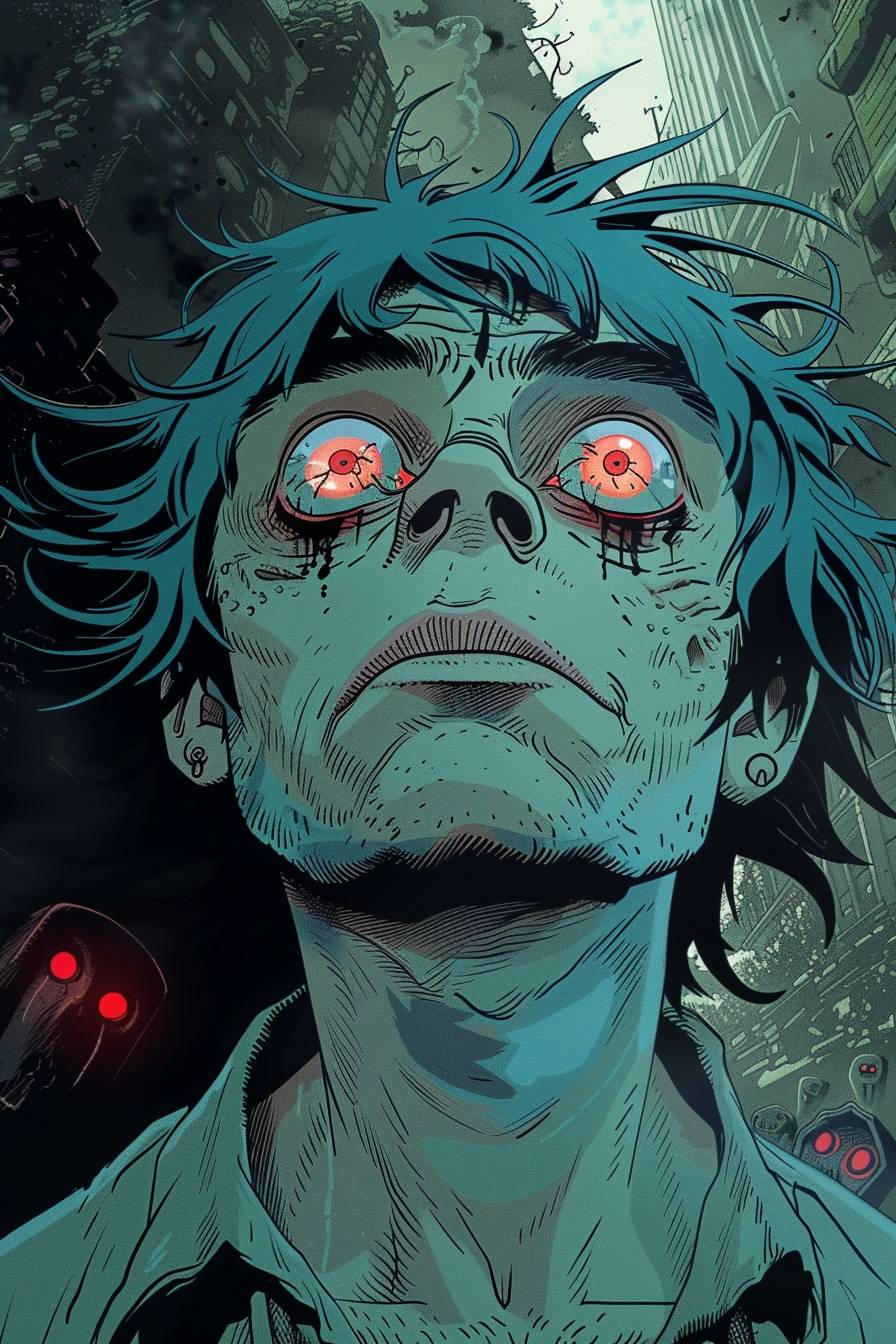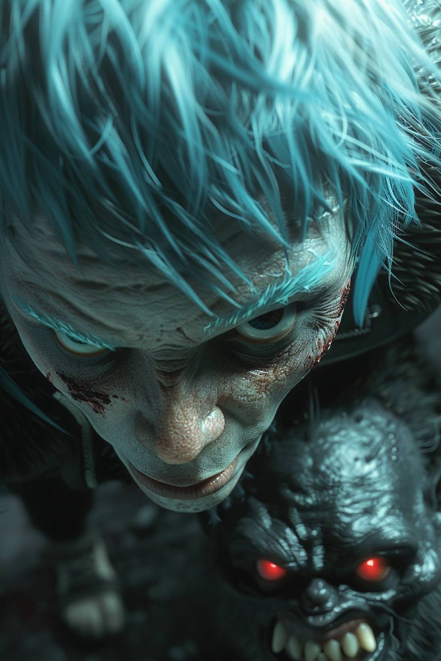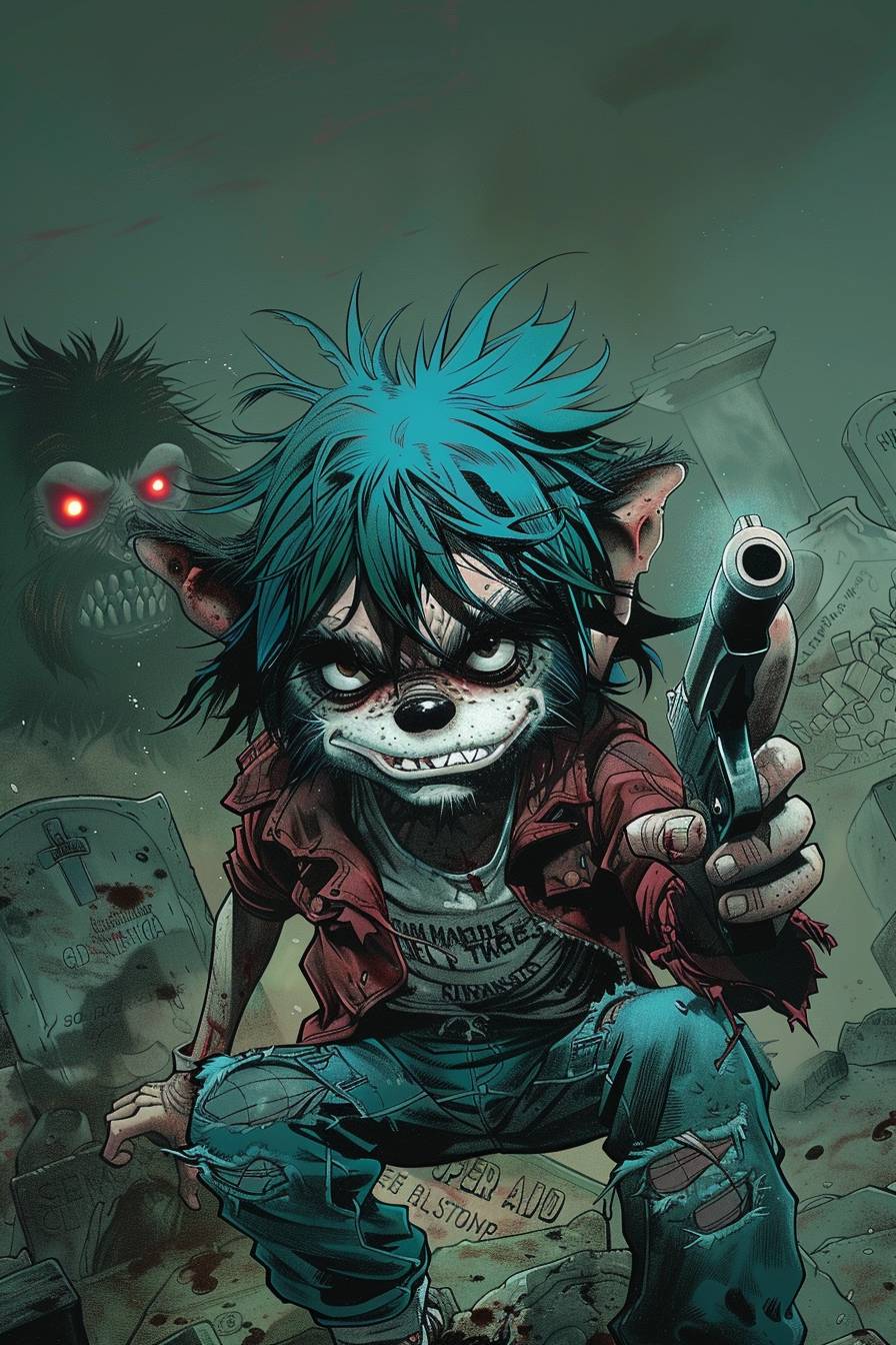 Clint Eastwood song by Gorrilaz clip. Jamie Hewlett Gorillaz meet Moebius illustration style. Stuart Harold a.k.a 2-D, Gorillaz virtual character. Spiky azure blue hair, black eyeball, empty eye socket, ((toothless or missing few of his upper teeth)), giving a flying kick hardly towards ((gigantic black grumpy gorrila with red eyes)) nearby graveyard. Motion speed effects, night scene. 3d rendered --ar 2:3 --stylize 300 --v 6.0