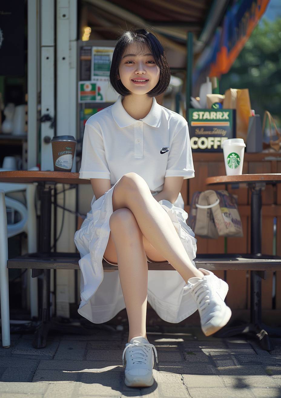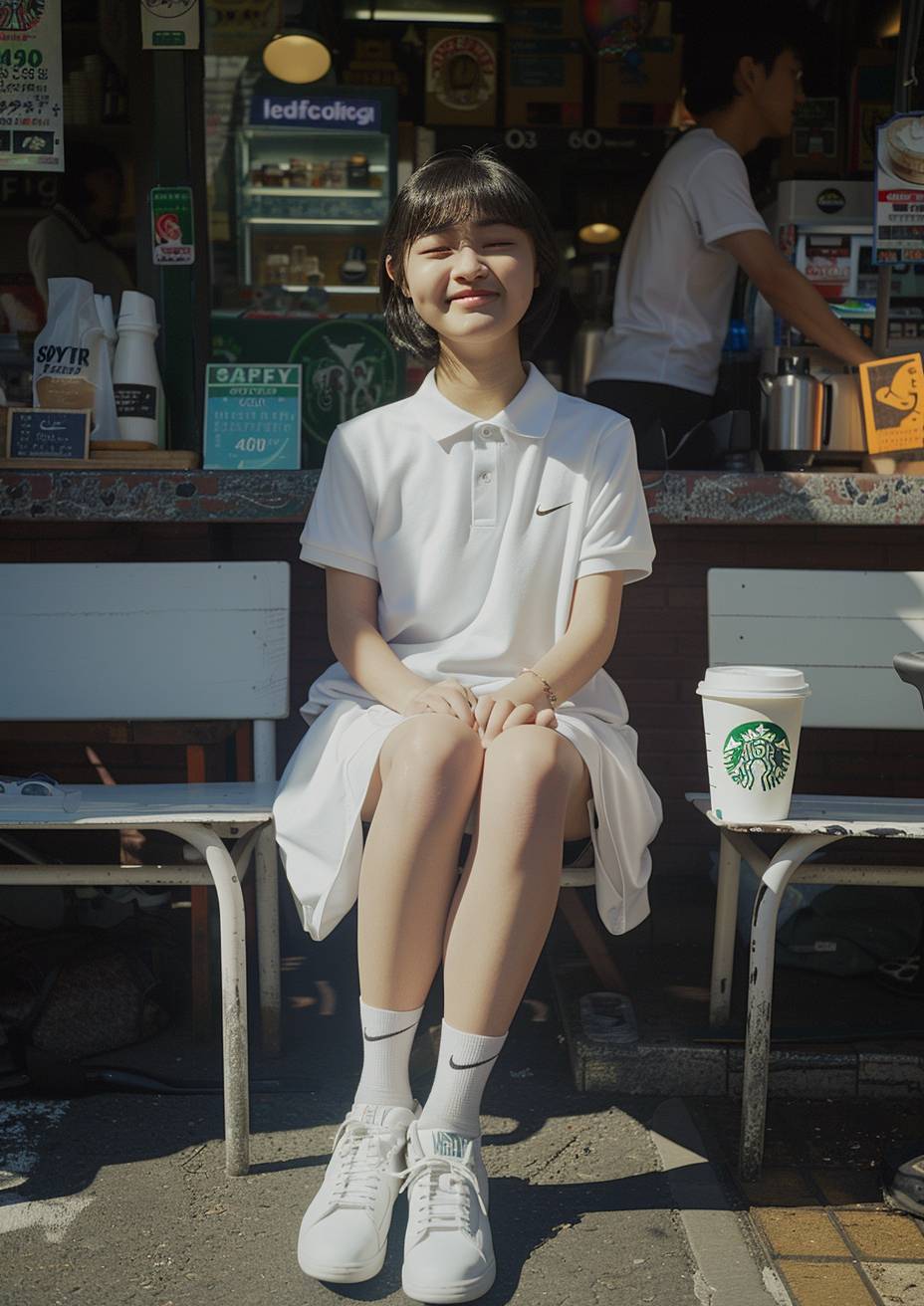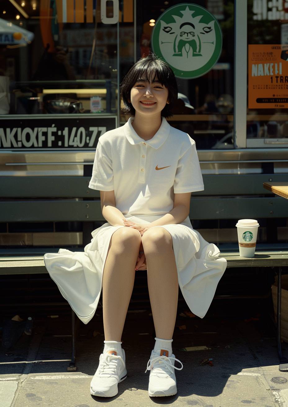 masterpiece, epic pose, 4K, natural lighting, rembrandt lighting | 15yo japanese cute girl, groomed strait short black hair, gently smile, crossed legs, Sunlight stabbing at her feet | wearing sporty fashion, white plain polo long sporty dress with nike's logo mark and Nike's sneaker, Starbucks cup of coffee her side on the seat | sit on seat in front of cafe stand, NYC, summer day, noon, dutch angle shot with Sony a7R IV, Fujicolor Superia X-TRA 400 film simulation --no logo mark, logo type, text, signboard, monochrome, retro --ar 5:7 --style raw --stylize 120 --v 6.0