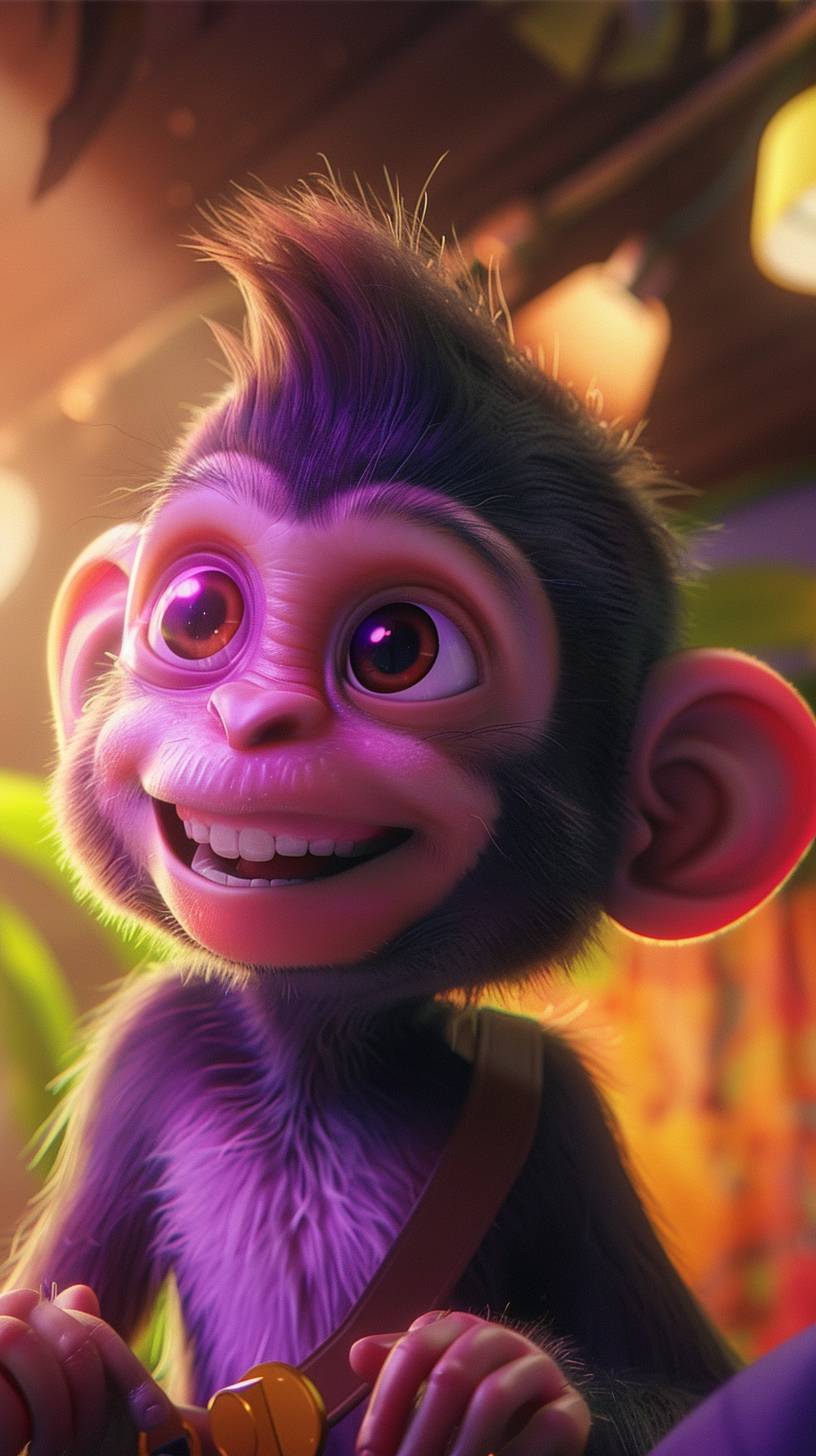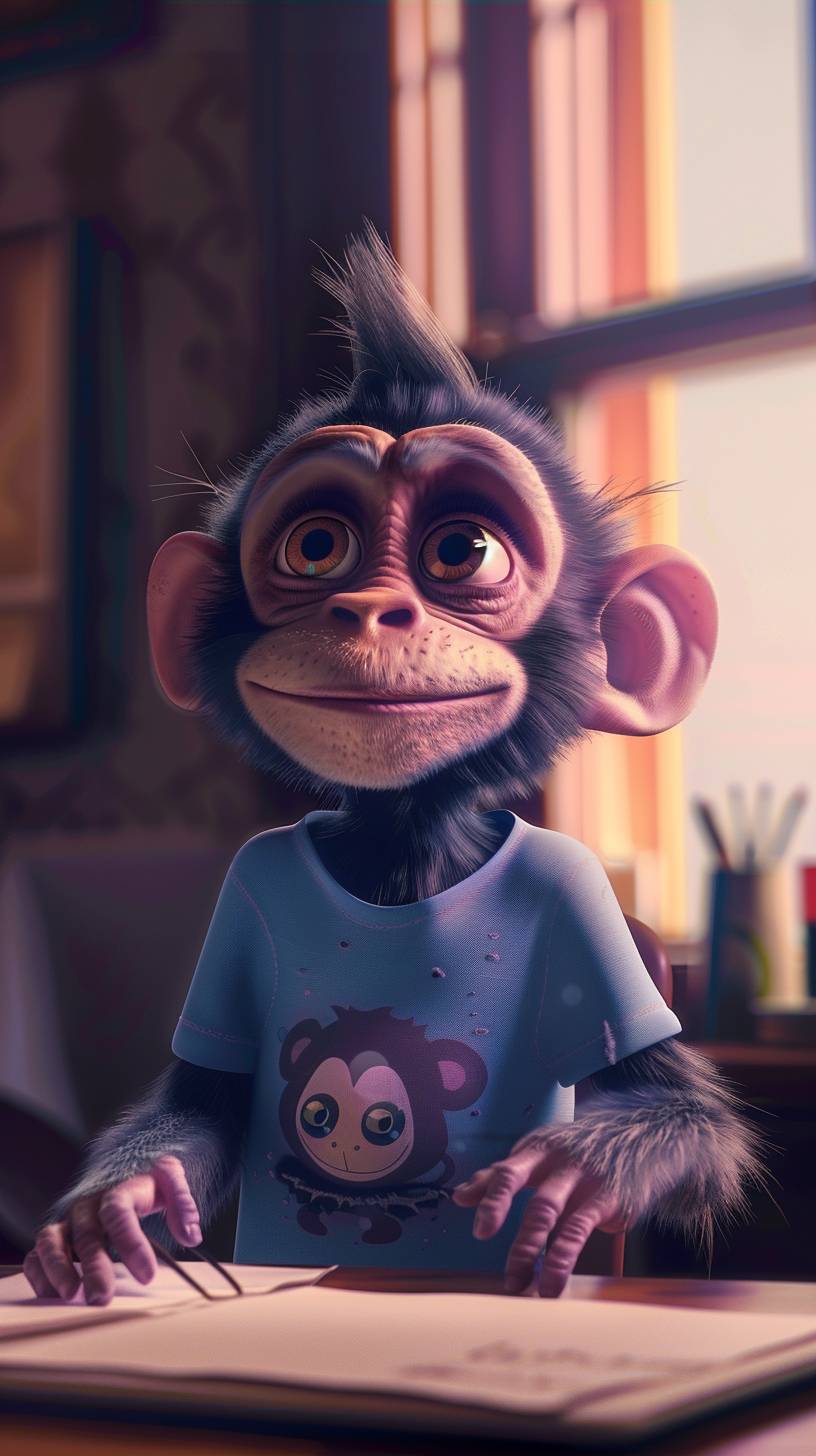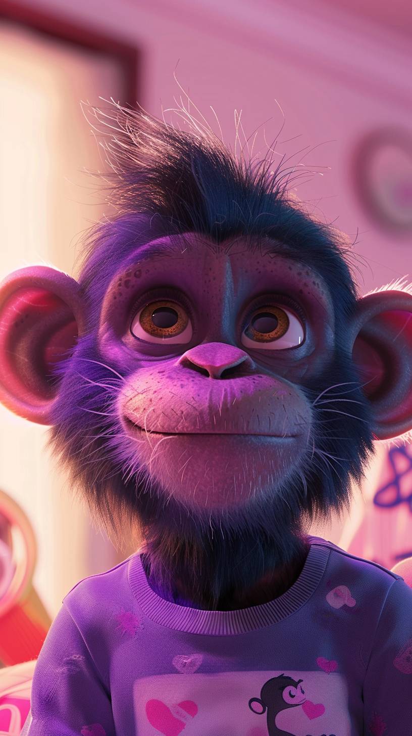 A young monkey is answering the interviewer's questions during an interview. He is wearing a T-shirt, purple and pink tone, bright tone and candy color, concept art by Pixar --ar 9:16 --v 6.0