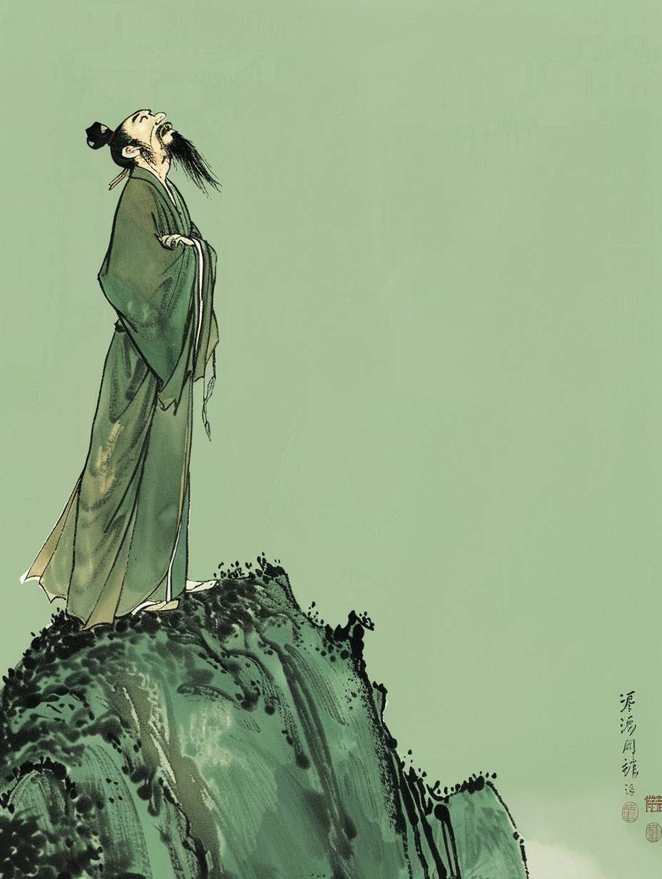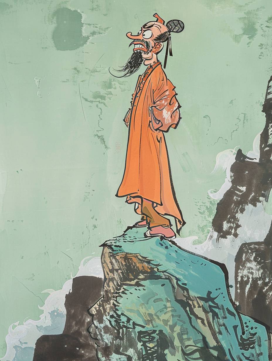 Chinese artist Huang Yongyu's depiction is full of comic exaggeration. An ancient Chinese poet, Li Bai, stands on a mountaintop, with an emotional expression and exaggerated facial expressions that emphasize the humor and weirdness. The background is a simple light green. Comic-like elements and playful exaggerations are used to emphasize the humor of the subject's appearance. --ar 3:4 --style raw --stylize 50 --v 6.0