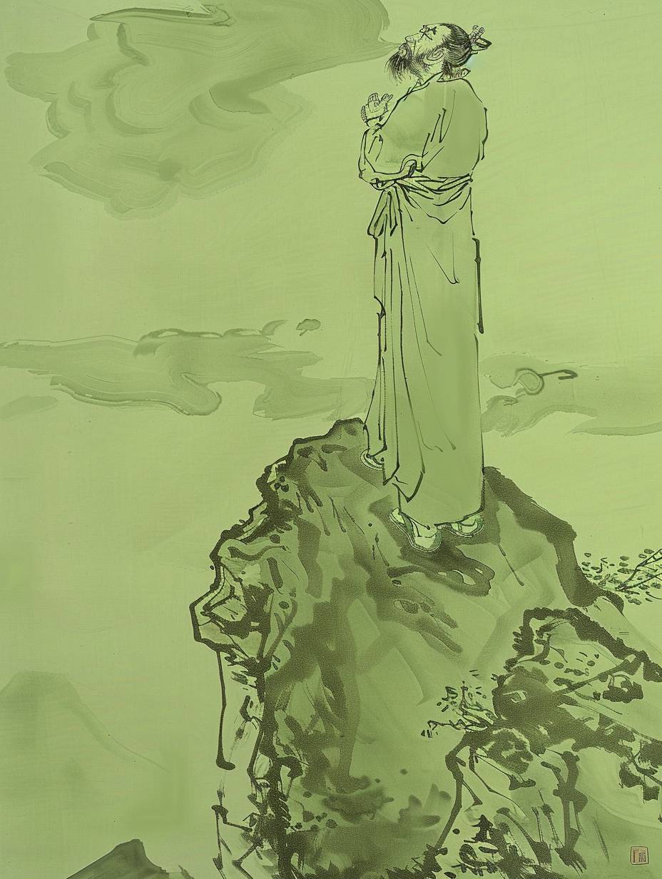 La représentation de l'artiste chinois Huang Yongyu est pleine d'exagération comique. Un ancien poète chinois, Li Bai, se tient au sommet d'une montagne, avec une expression émotionnelle et des expressions faciales exagérées qui soulignent l'humour et la bizarrerie. L'arrière-plan est d'un simple vert clair. Des éléments de style bande dessinée et des exagérations ludiques sont utilisés pour souligner l'humour de l'apparence du sujet.