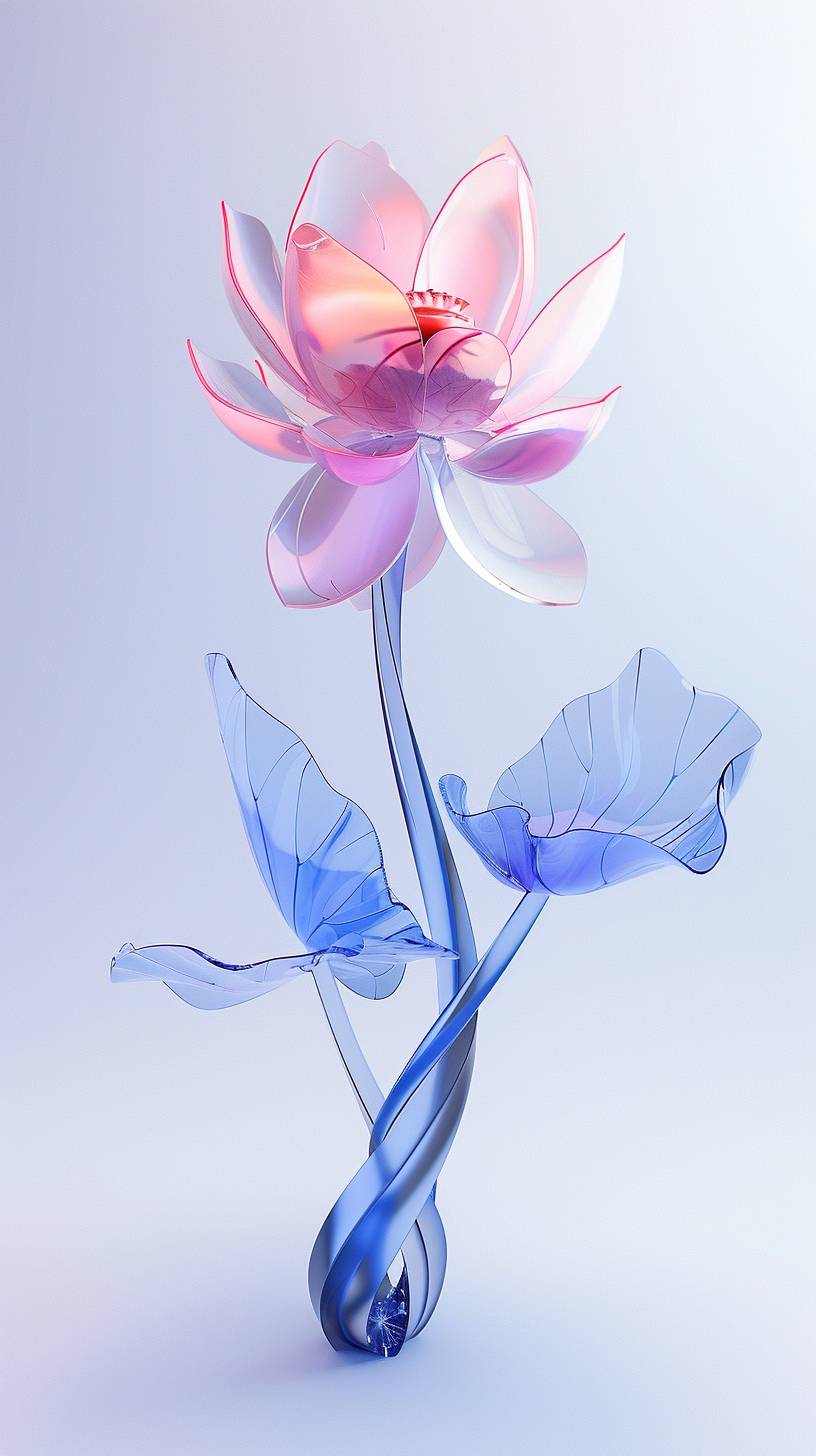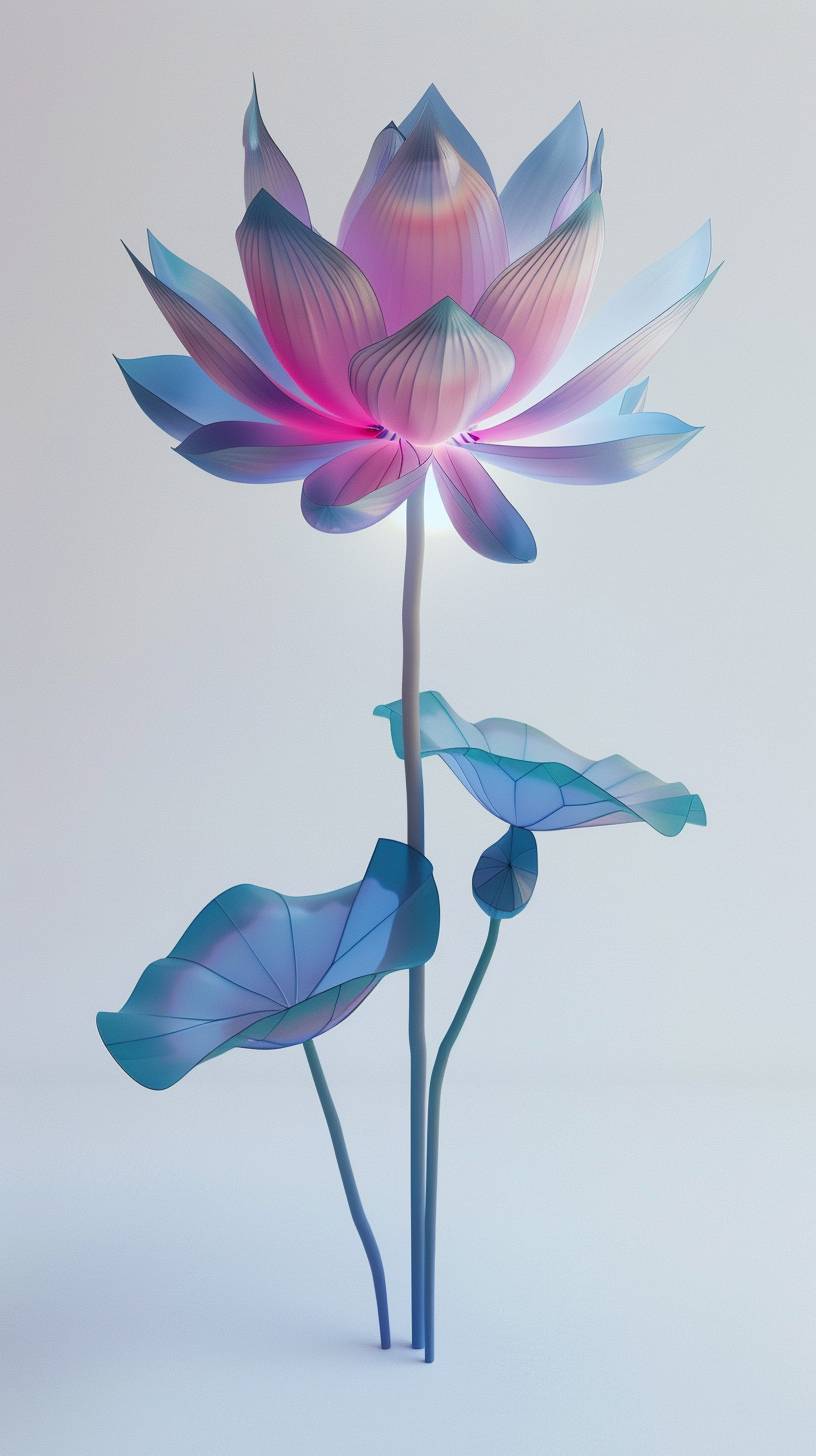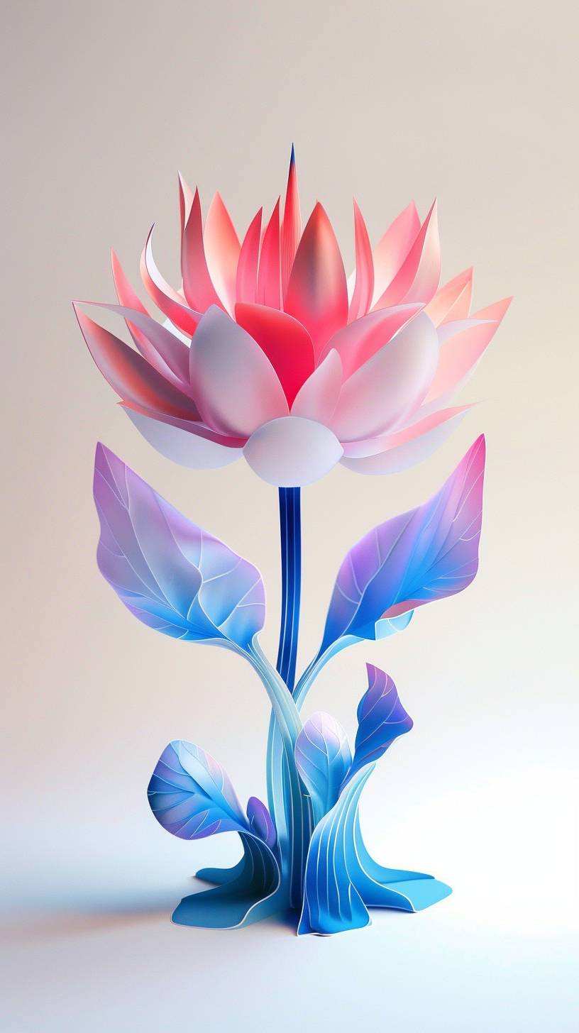 a 3D single botanical tall lotus flower plant art in pink to blue saturated color on a white background, in the style of minimalist sculpture, spotlight in the cente, colorful woodcarvings, piles/stacks, colorful animation stills, majismo, fluid, organic forms, full f10 aperture --ar 9:16 --v 6.0