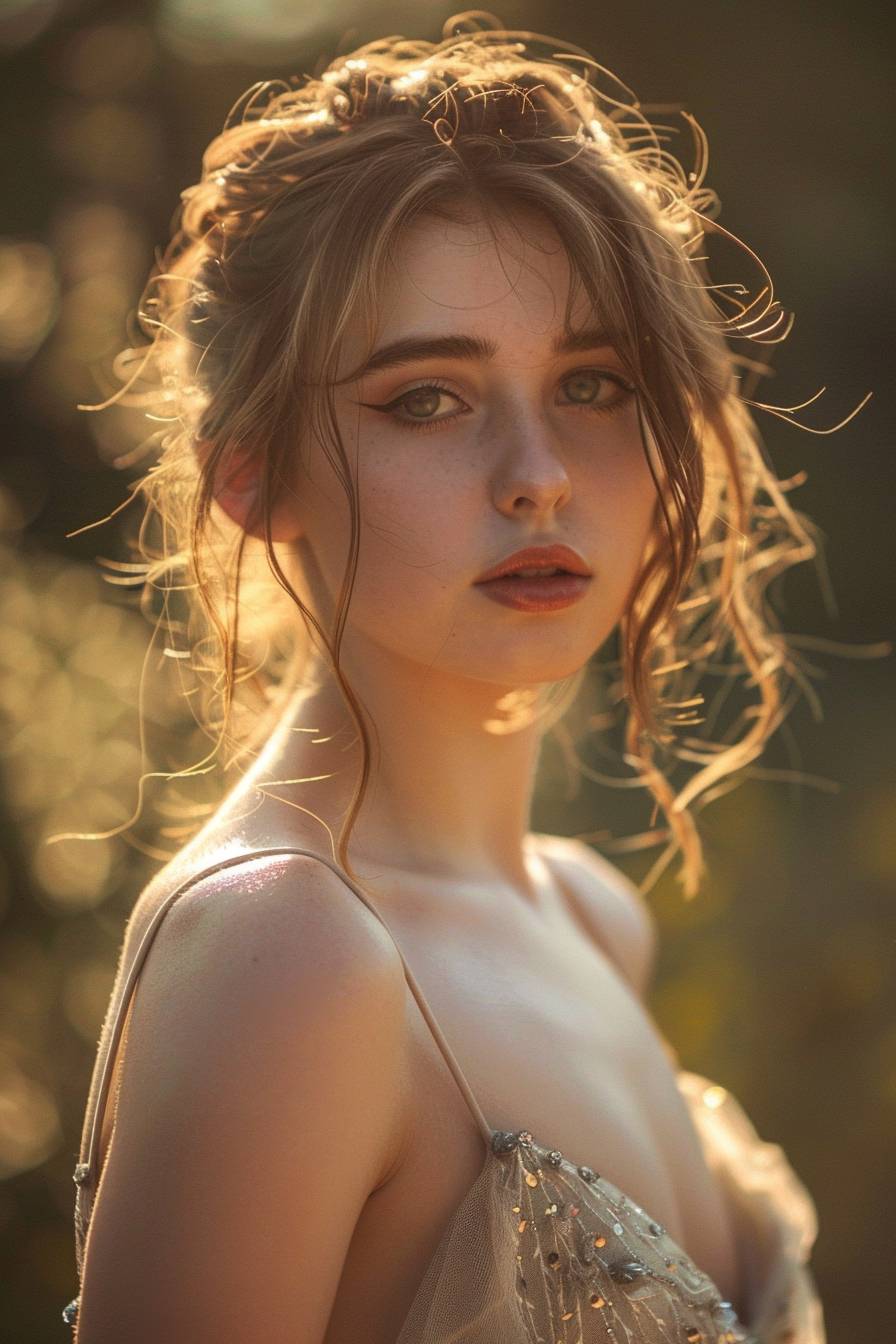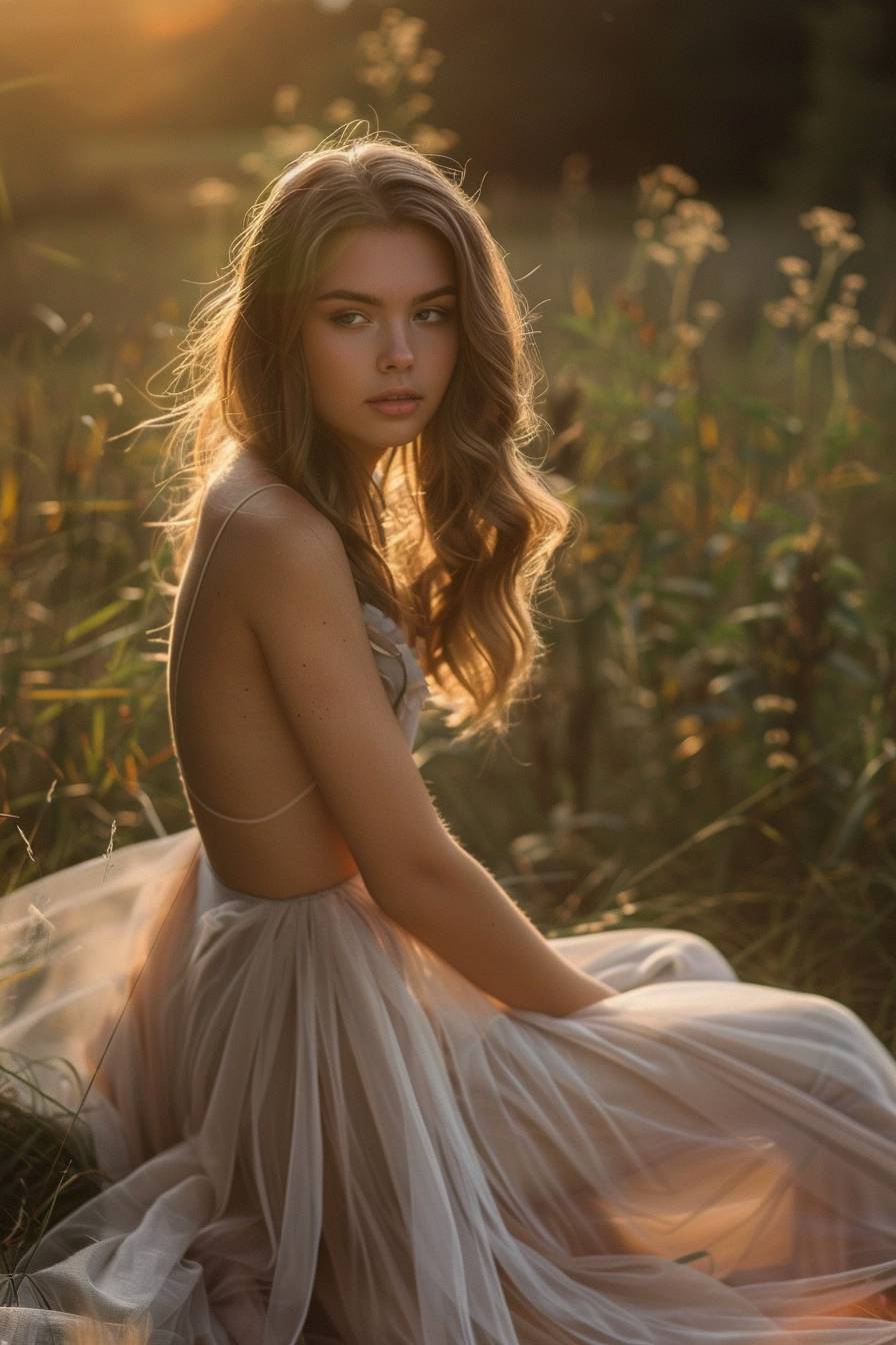 Jeune femme glamour montrant une posture gracieuse, douce lumière de l'heure dorée, ombres délicates, robe fluide et regard captivant.