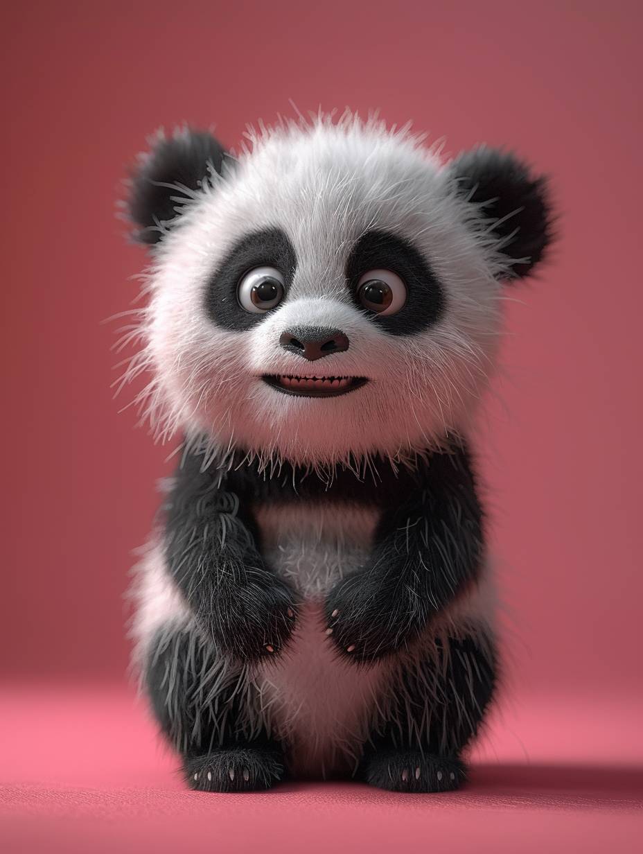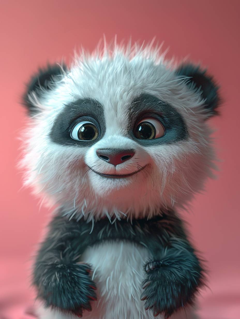 Un panda adorable de style anime, légèrement fluffy, avec des expressions riches de bonheur et de joie, affichant une texture en peluche 3D sur un fond rose, dans un style Q-version, en 4K, avec des détails riches et des éléments minimaux.