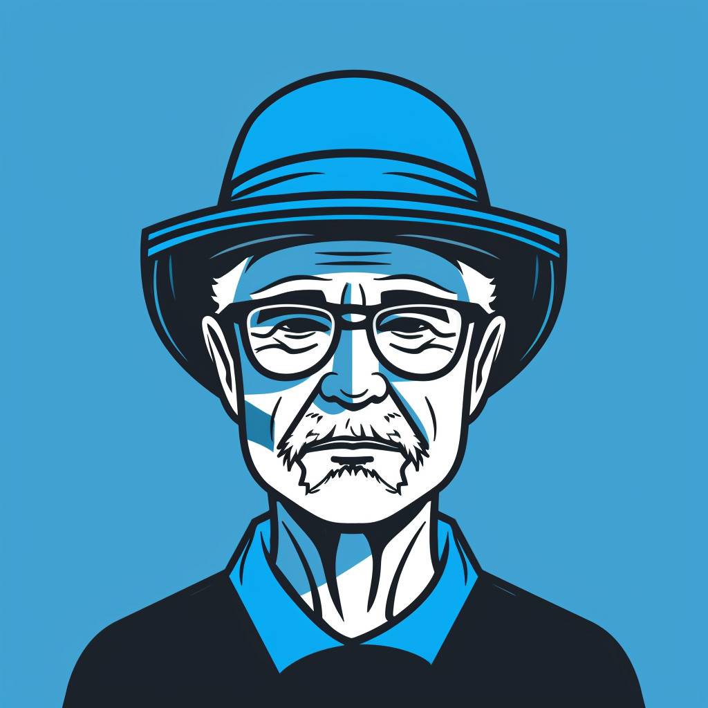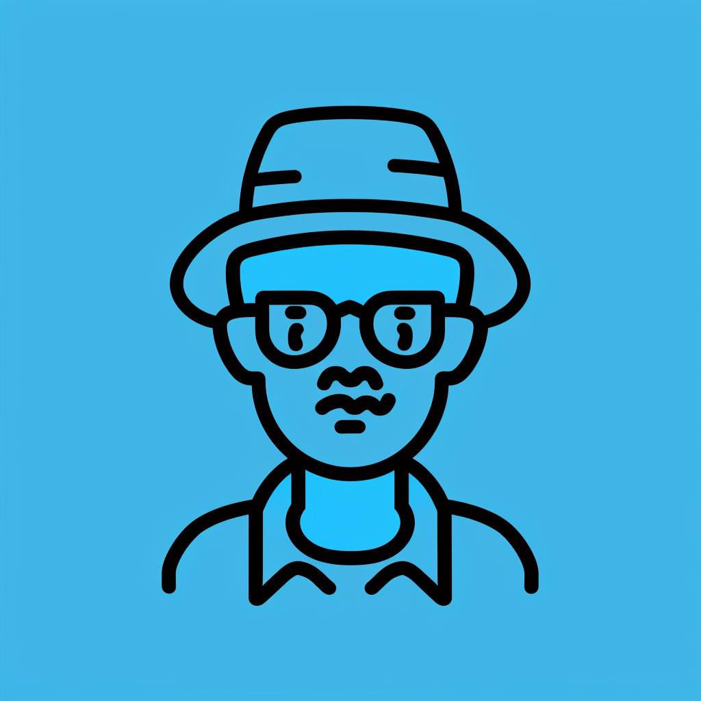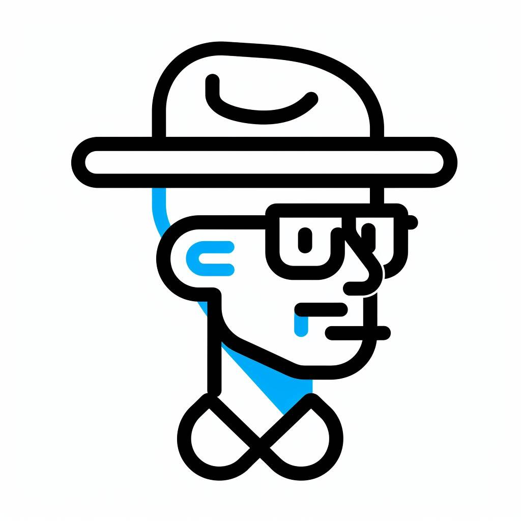 Le logo représente un homme d'âge moyen portant un chapeau à bec de canard, avec des lignes noires et bleues dans un style de design plat, adapté au minimalisme d'UI et d'applications.