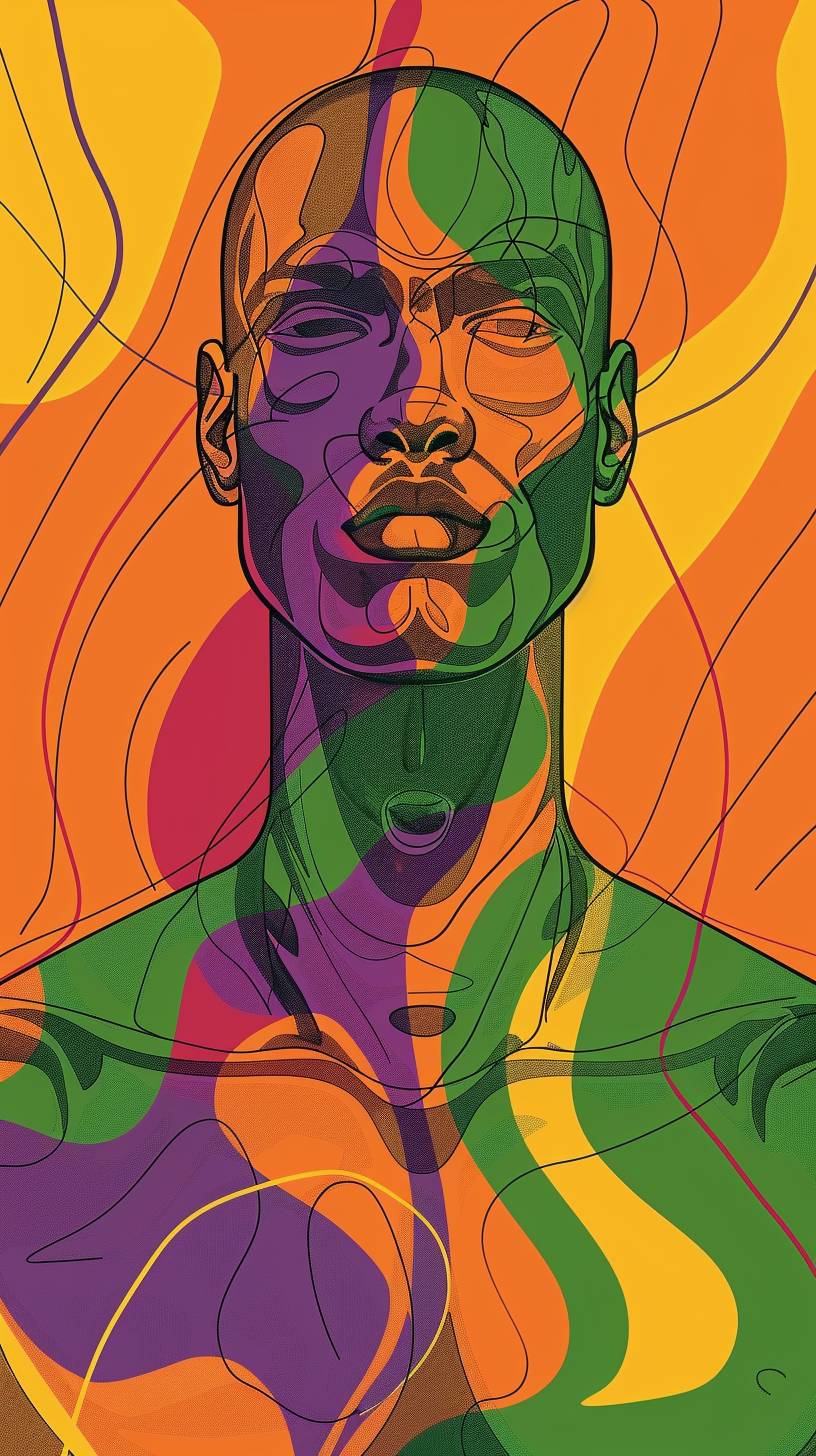 illustration, partie supérieure du corps, homme, de face, simplifier, consistant en orange et vert avec des couleurs limites violettes, fond artistique et stylé, chef-d'œuvre
